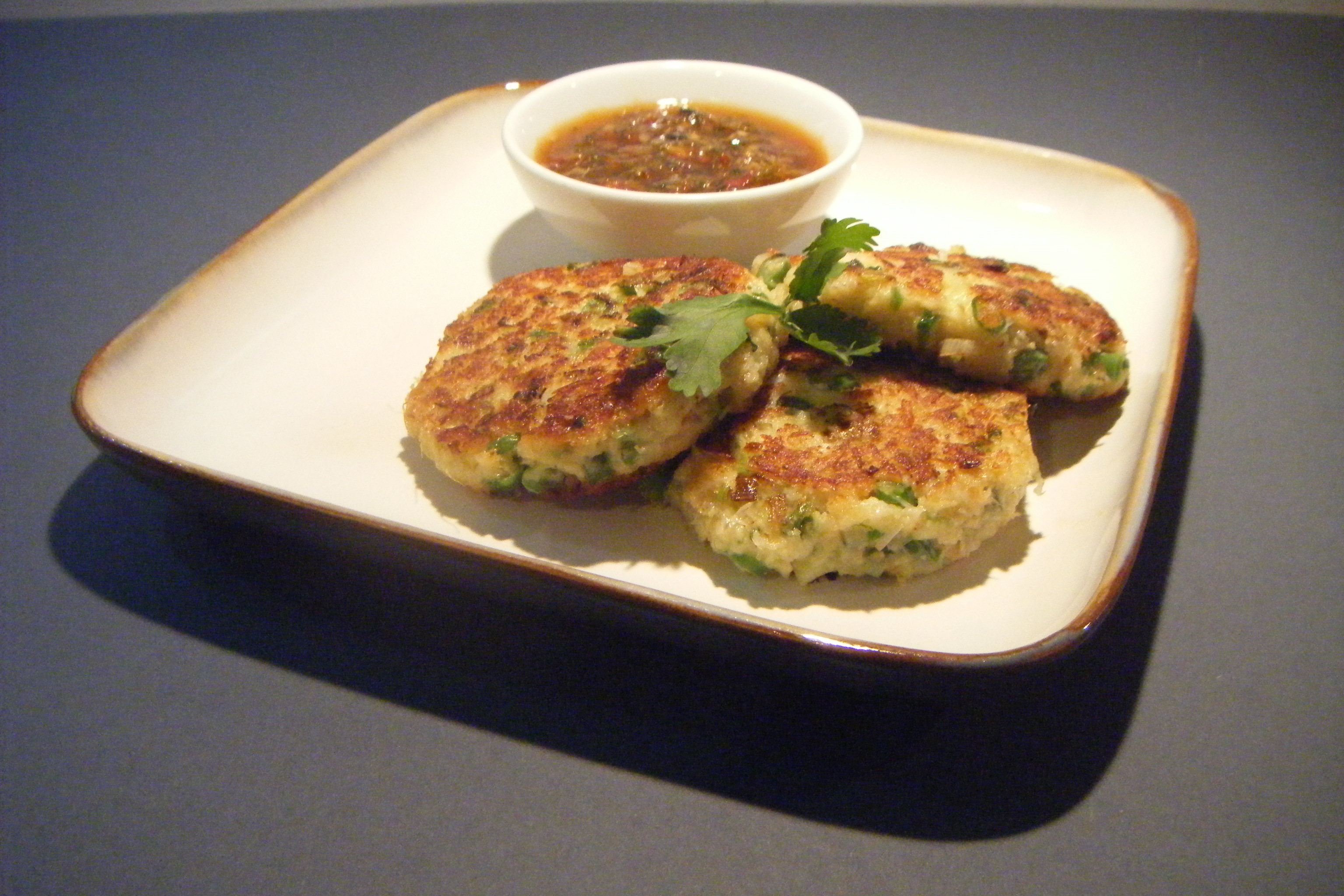 - Heat 1-2 tbsp sunflower oil in a frying pan and cook 4 crab cakes at a time until golden brown on both sides. Remove from the pan and keep warm while you cook the remainder. Serve with the sweet chilli dipping sauce.