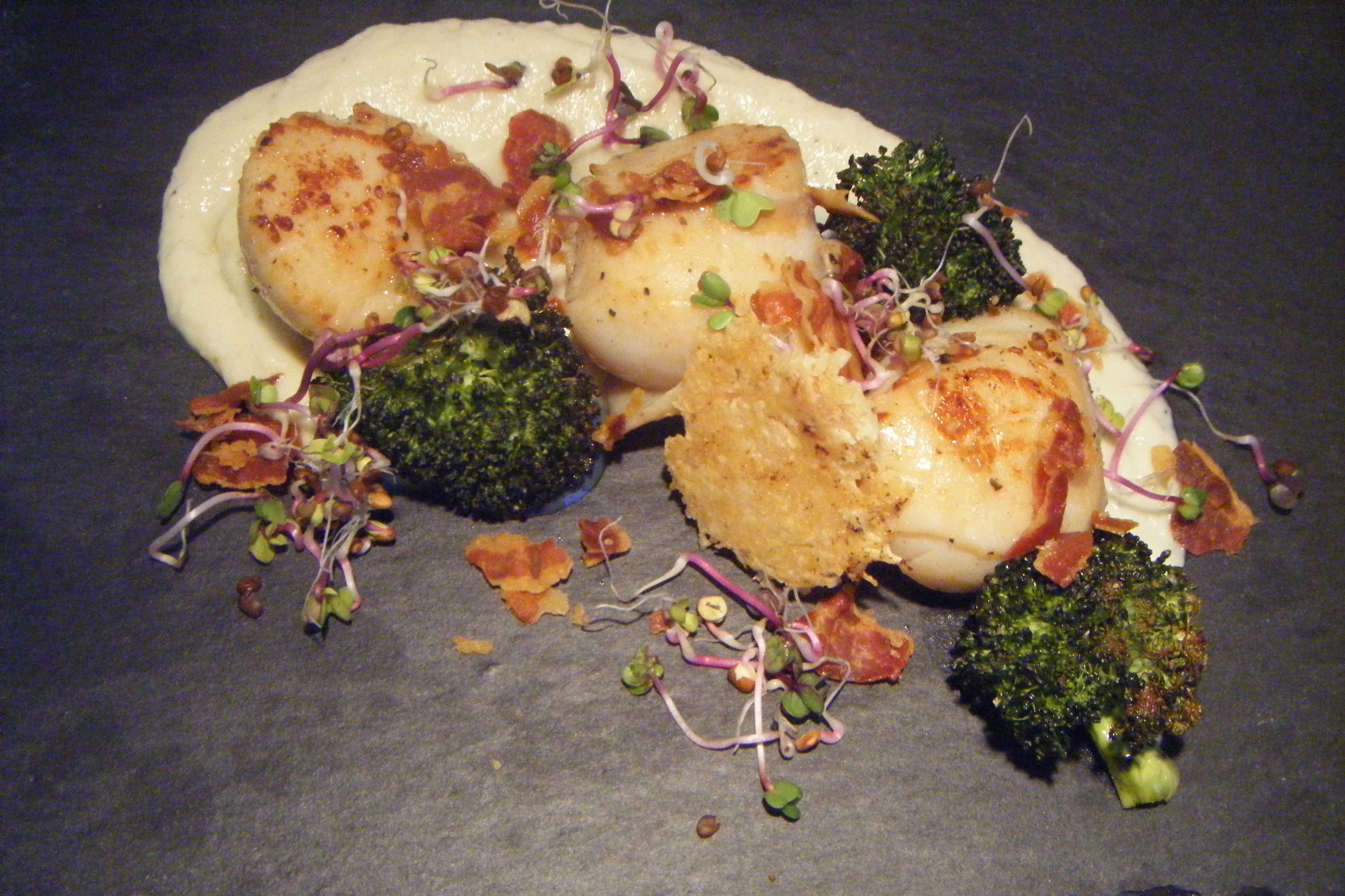 SCALLOPS WITH WHITE ONION PUREE, ROASTED BROCCOLI, CRISP PANCETTA AND A PARMESAN CRISPS