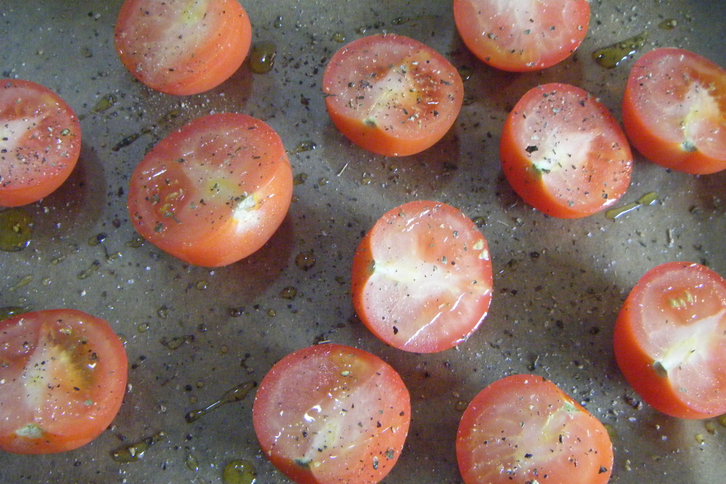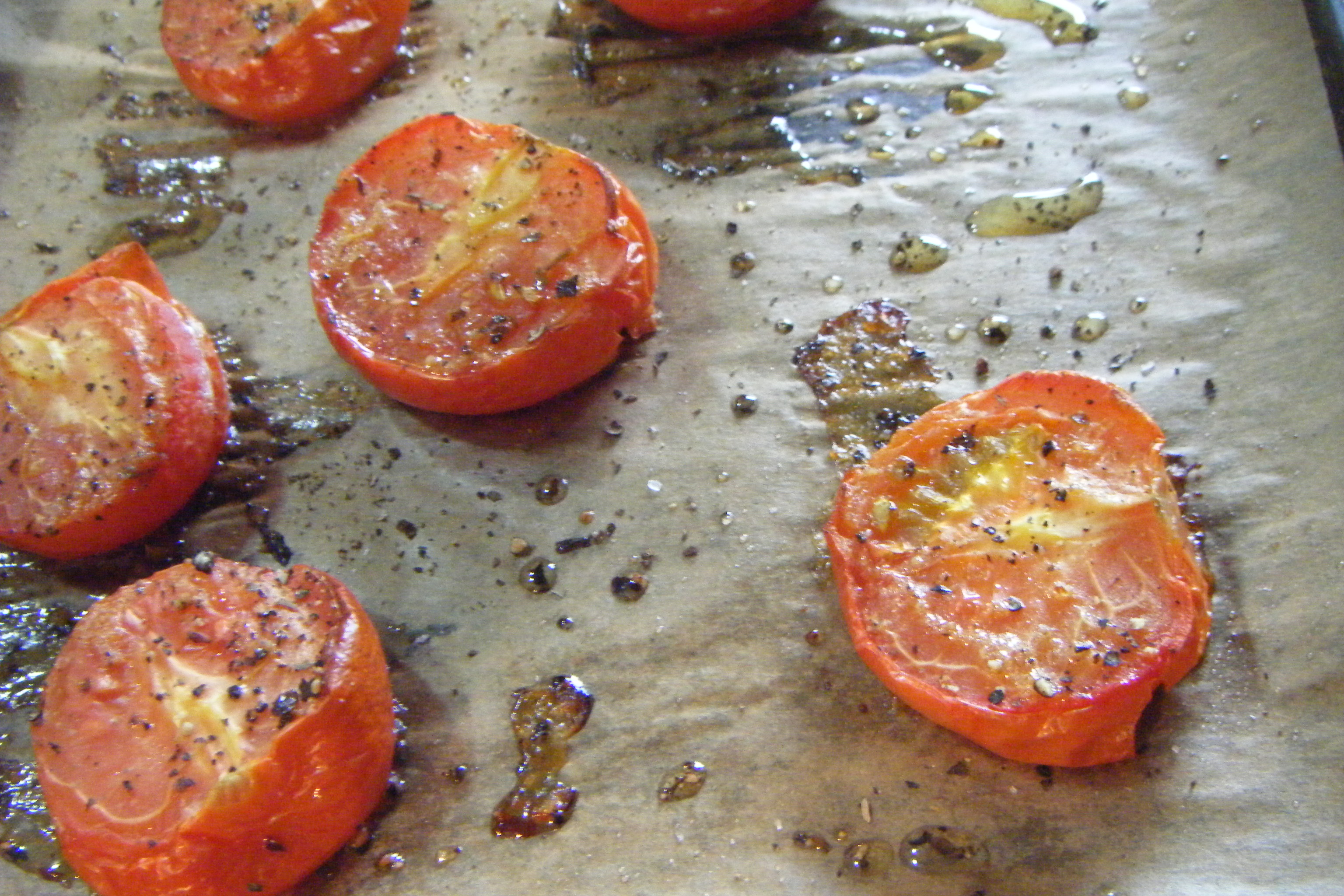 Heat the oven to 180 °c/160 °c (fan oven). Put the tomatoes onto a baking tray, drizzle with olive oil and season. Pop into the oven for 40 minutes until they look like they are melting.
