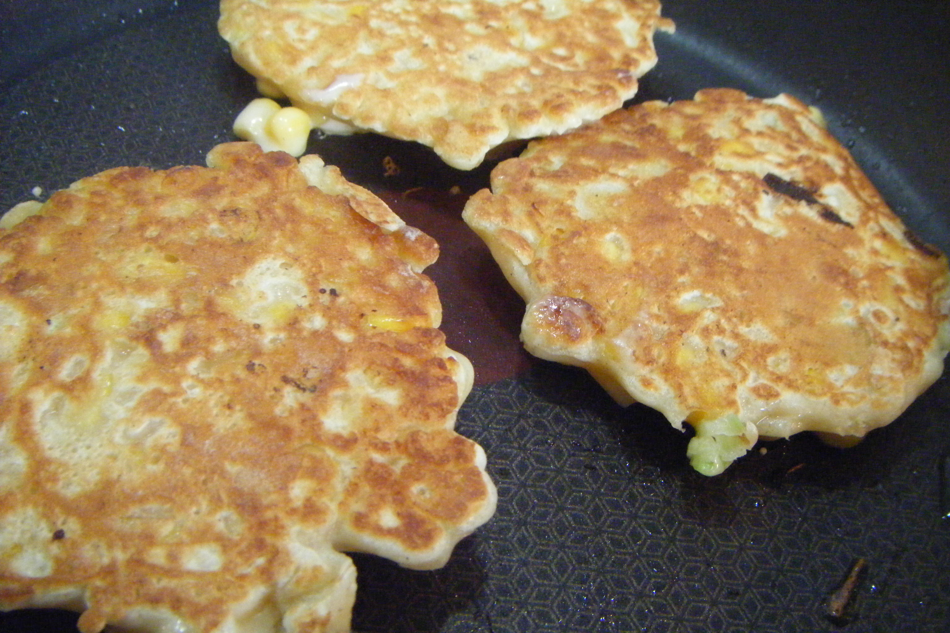Heat a large frying pan (non stick) and drizzle with oil. Spoon a tablespoon of corn batter into the pan and repeat. Cook for 2-3 minutes on each side and turn.