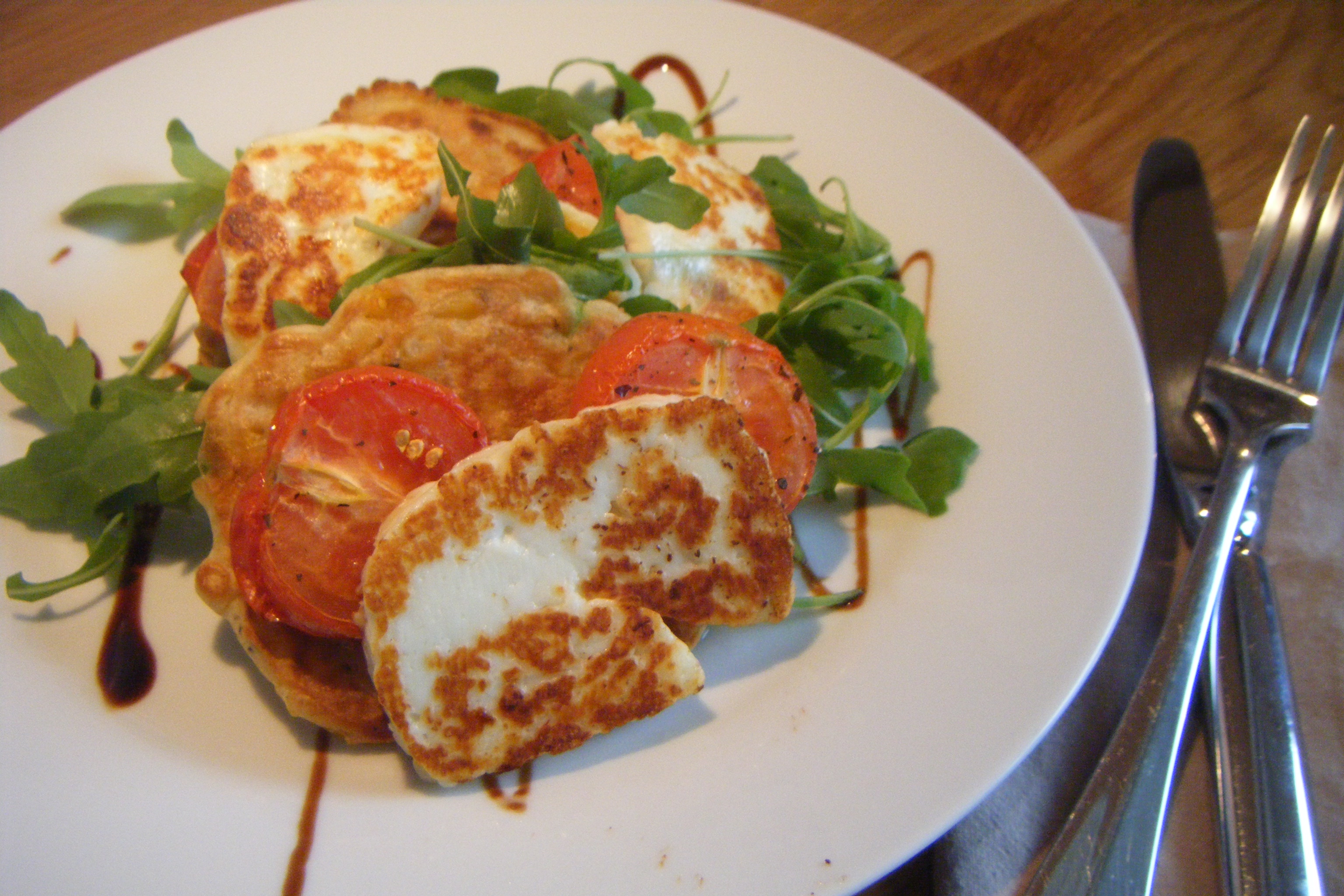 Keep warm in the oven as you can only fit so many in the pan at one time. When the tomatoes are ready, remove from the oven and grill or fry the halloumi until golden.