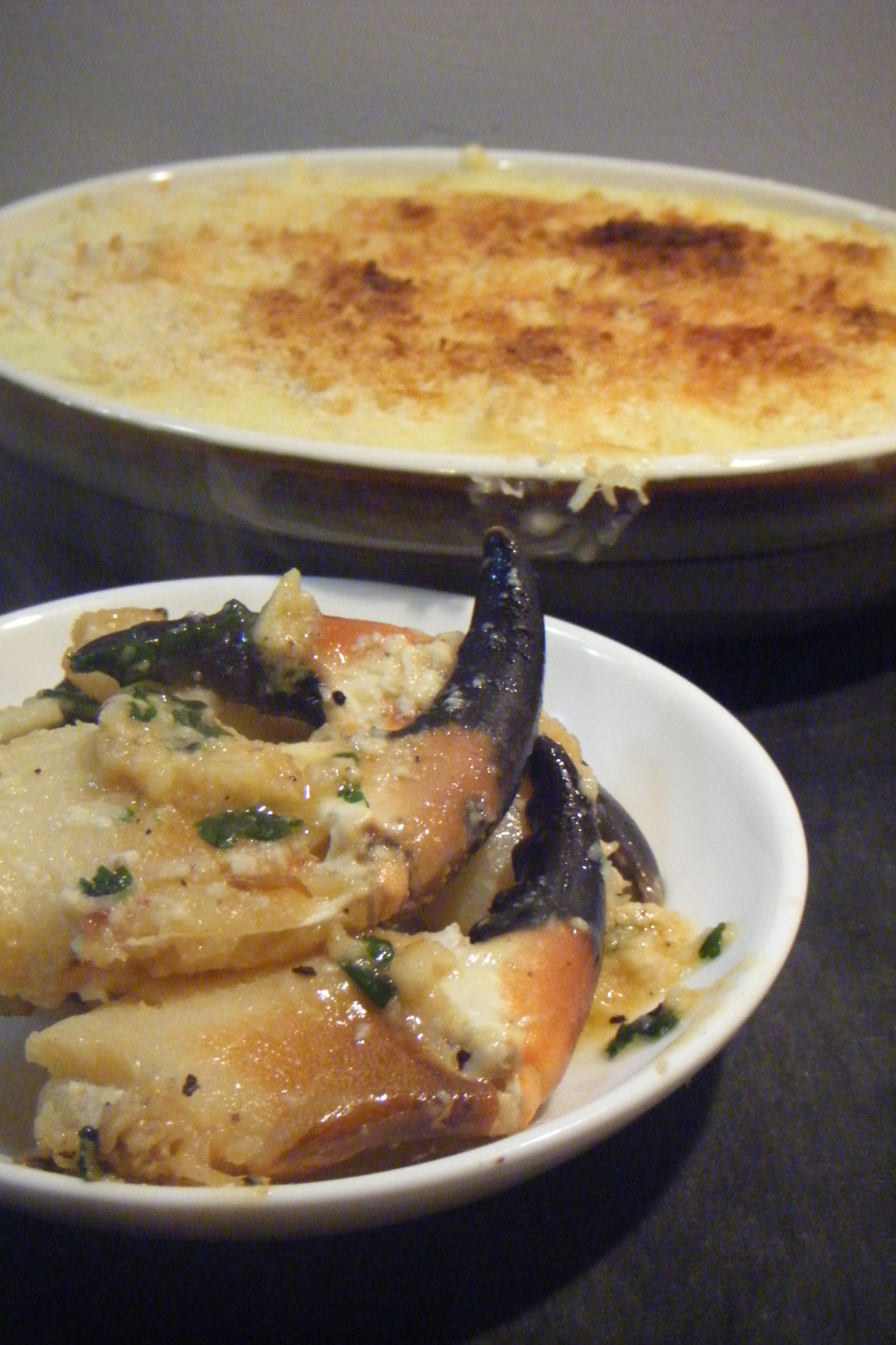 PRAWN GRATIN WITH GARLICKY CRAB CLAWS