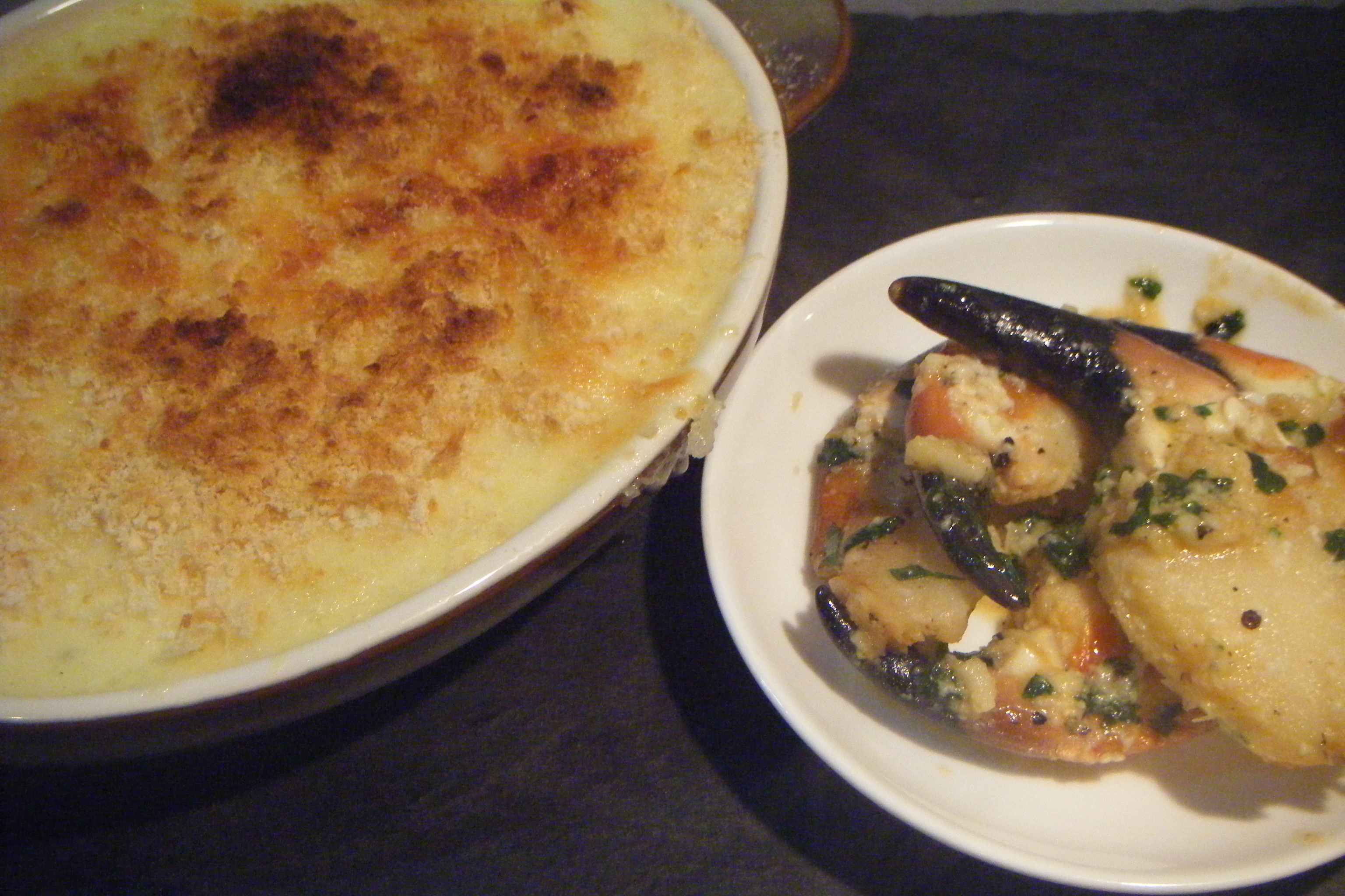 I didn’t feel bad at all, but I did want to make something nice with the bits and bobs that were still lurking in our top shelf (meat and fish section) and came up with forgive me prawn gratin. Quite easy and it gave me lots of ideas for nice fish pies which I will try out in the next few weeks. I wanted to use crab but didn’t have any crab meat, just claws and then some little prawns. So it was, Prawn gratin and garlicky crab claws. Very tasty, easy and could be made with many different fish or add in whatever veg you might have. Like I say, next time I will make this into a fish pie, by adding some chopped potatoes, and veg (onion, peas, carrots, celery).