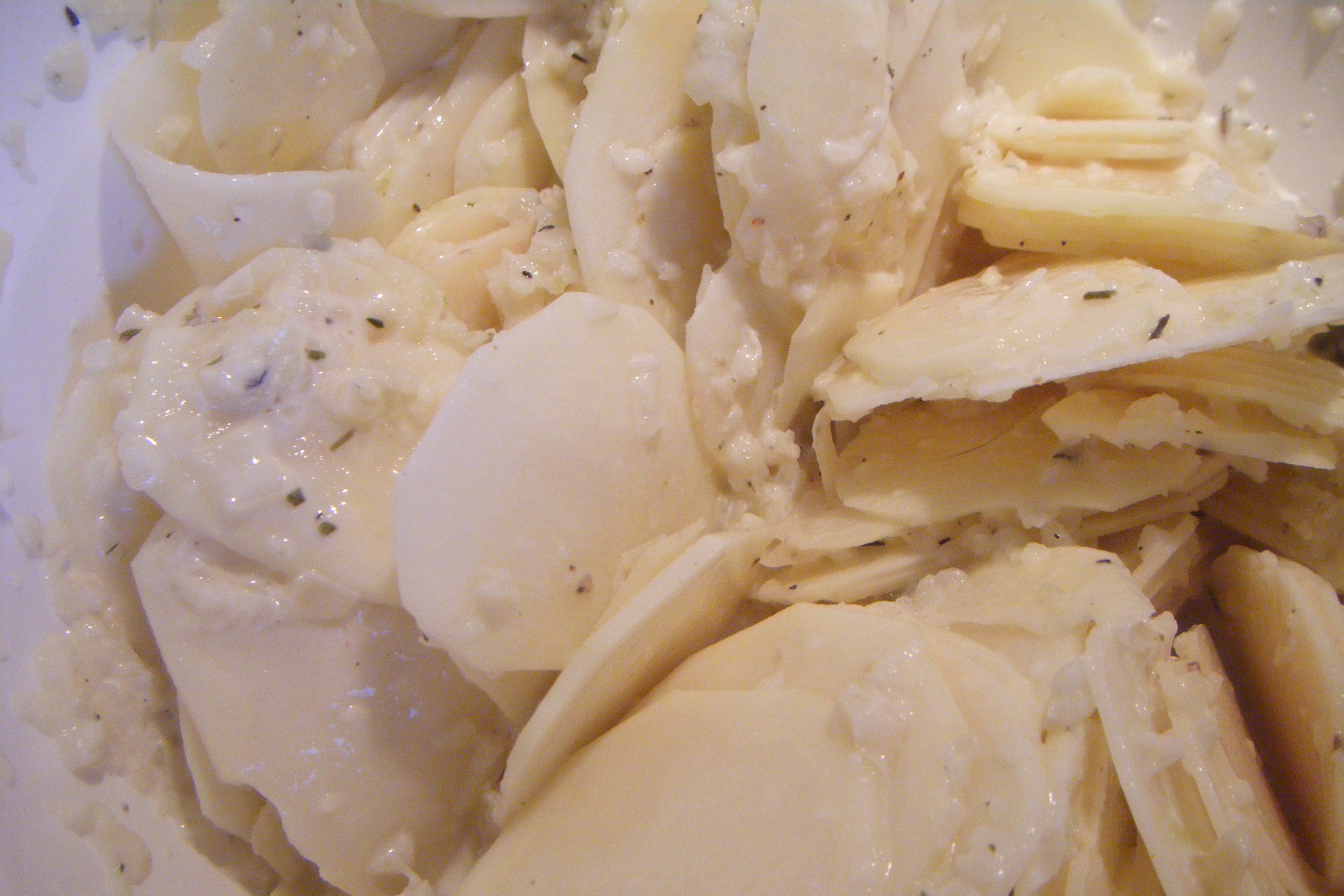 Start by slicing your potatoes into thin discs. I use my food processor for this or you could use a mandolin if you have one and place in a bowl large enough to be able to toss them with the liquid.