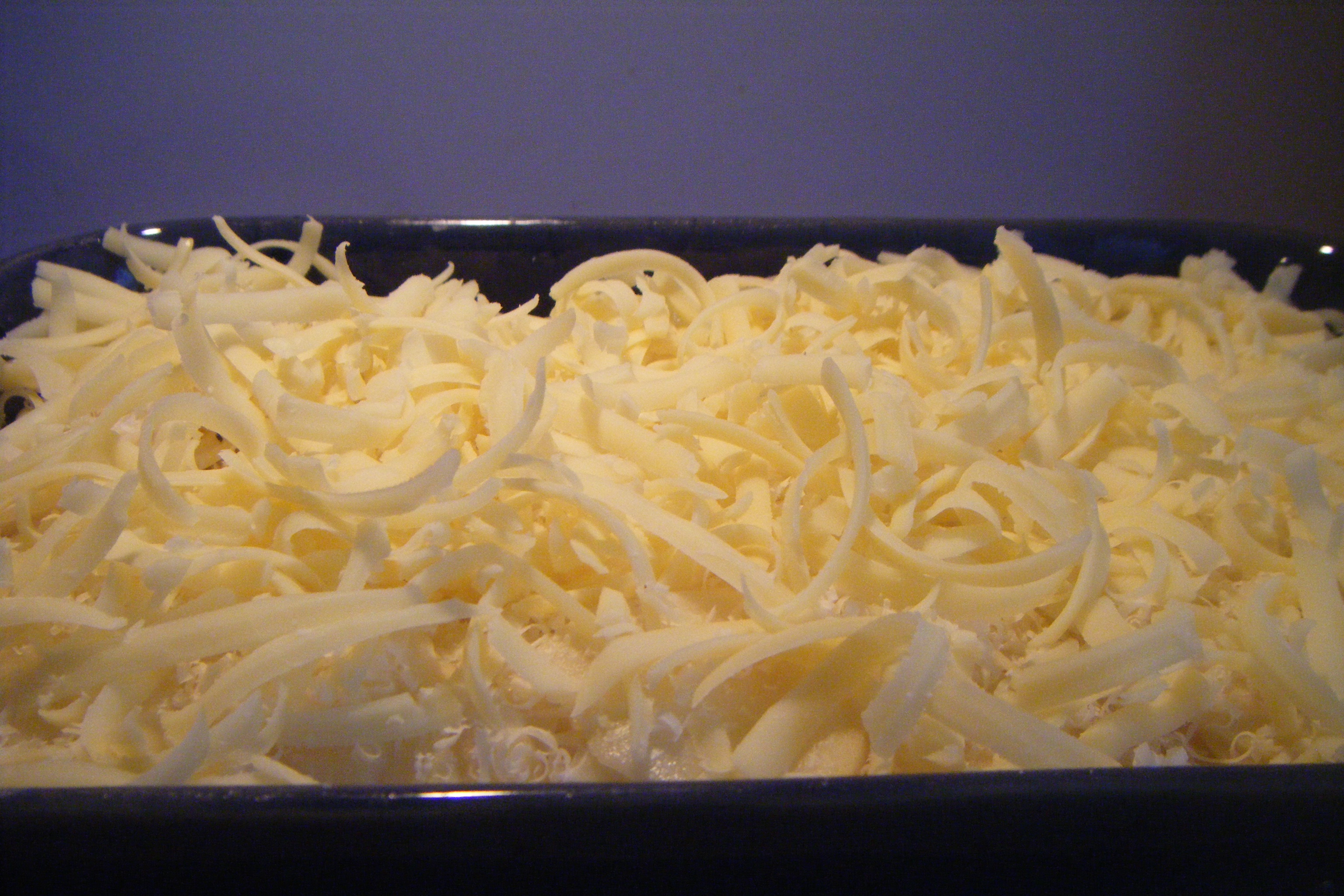 Pour into a baking dish and cover with a sprinkling of cheese.