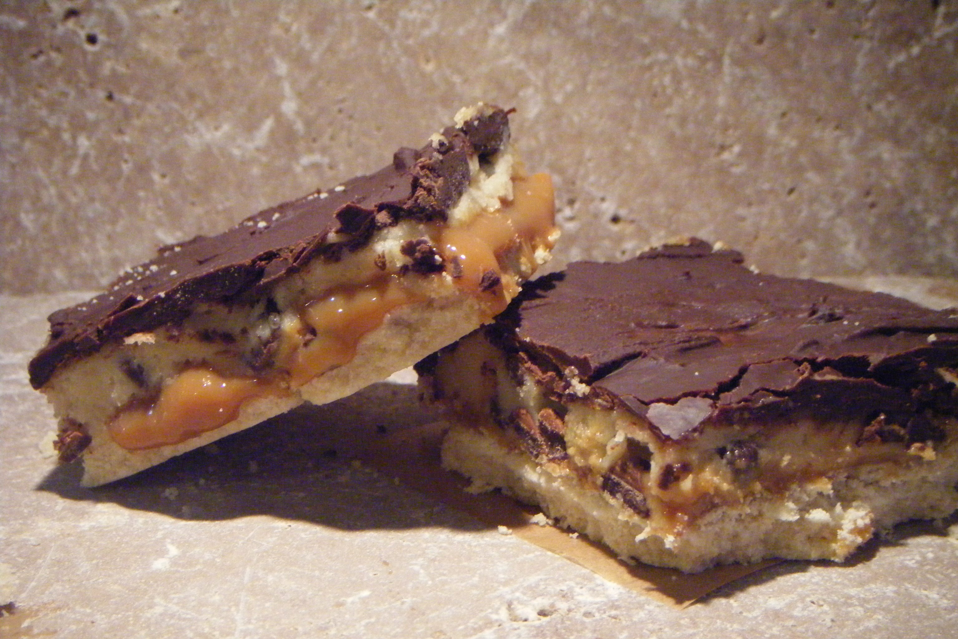 These are difficult little treats to photograph, but are melt in the mouth. The cookie recipe has to be slightly adapted so not to kill or make you sick. Instead of the egg, I used 5 tbsp milk and I left out the nuts as that might have been too much for the squares. Make these with a fairly thick caramel or it will run out of the squares once cut.