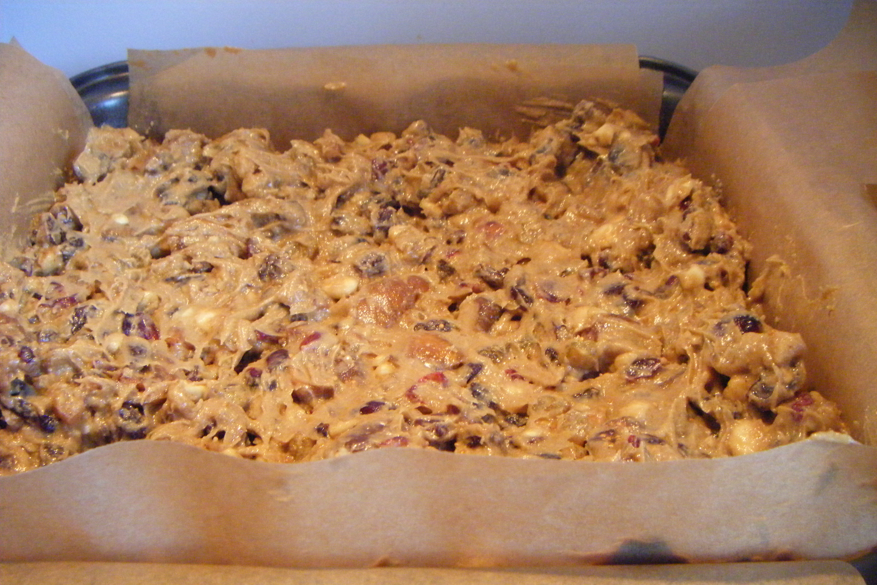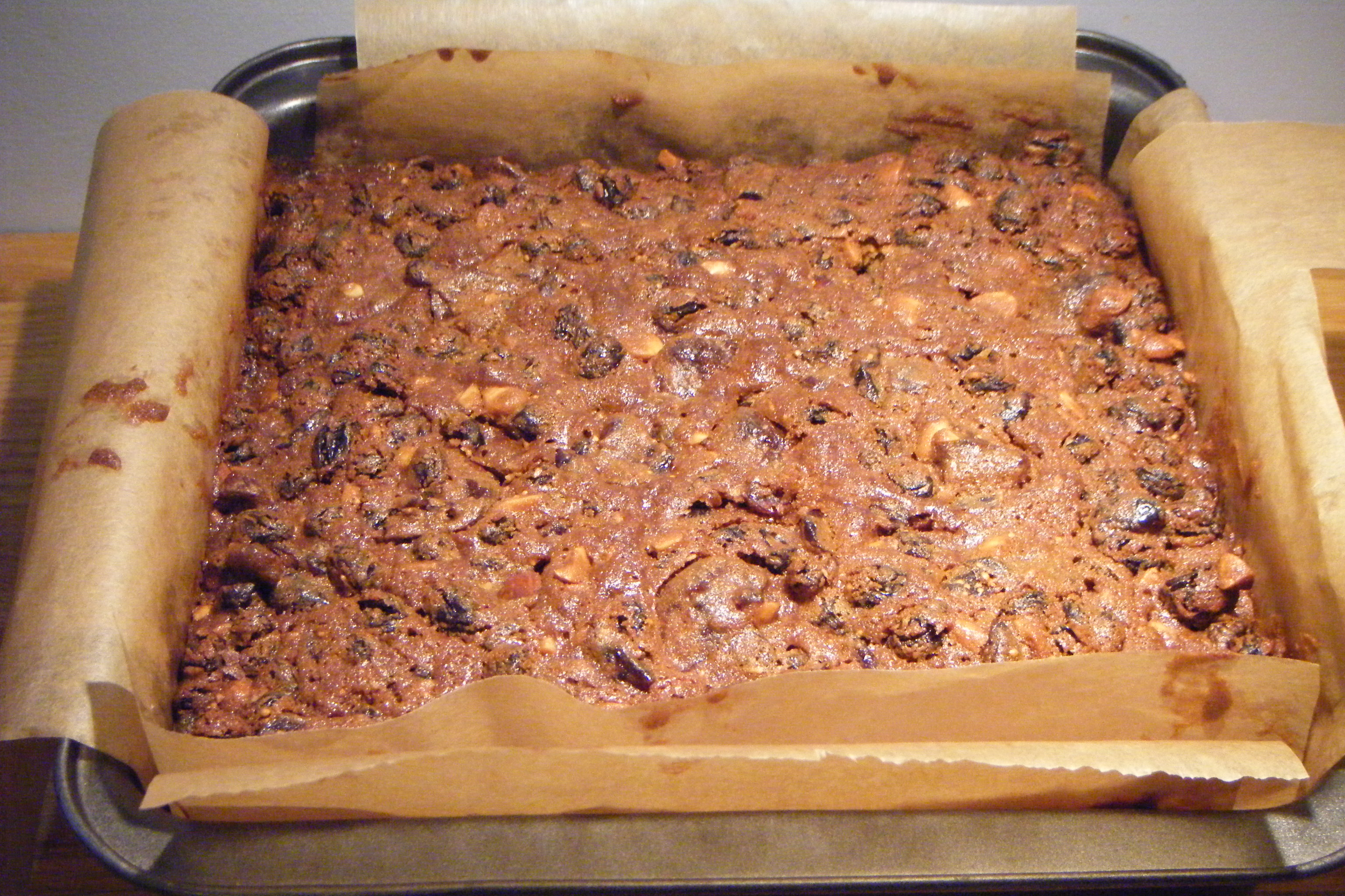 Line the base and sides of a 20cm tin ( round or square) with a double layer of baking paper. In a large bowl mix the fruit, almonds and figs. Add the flour and spices and mix again.