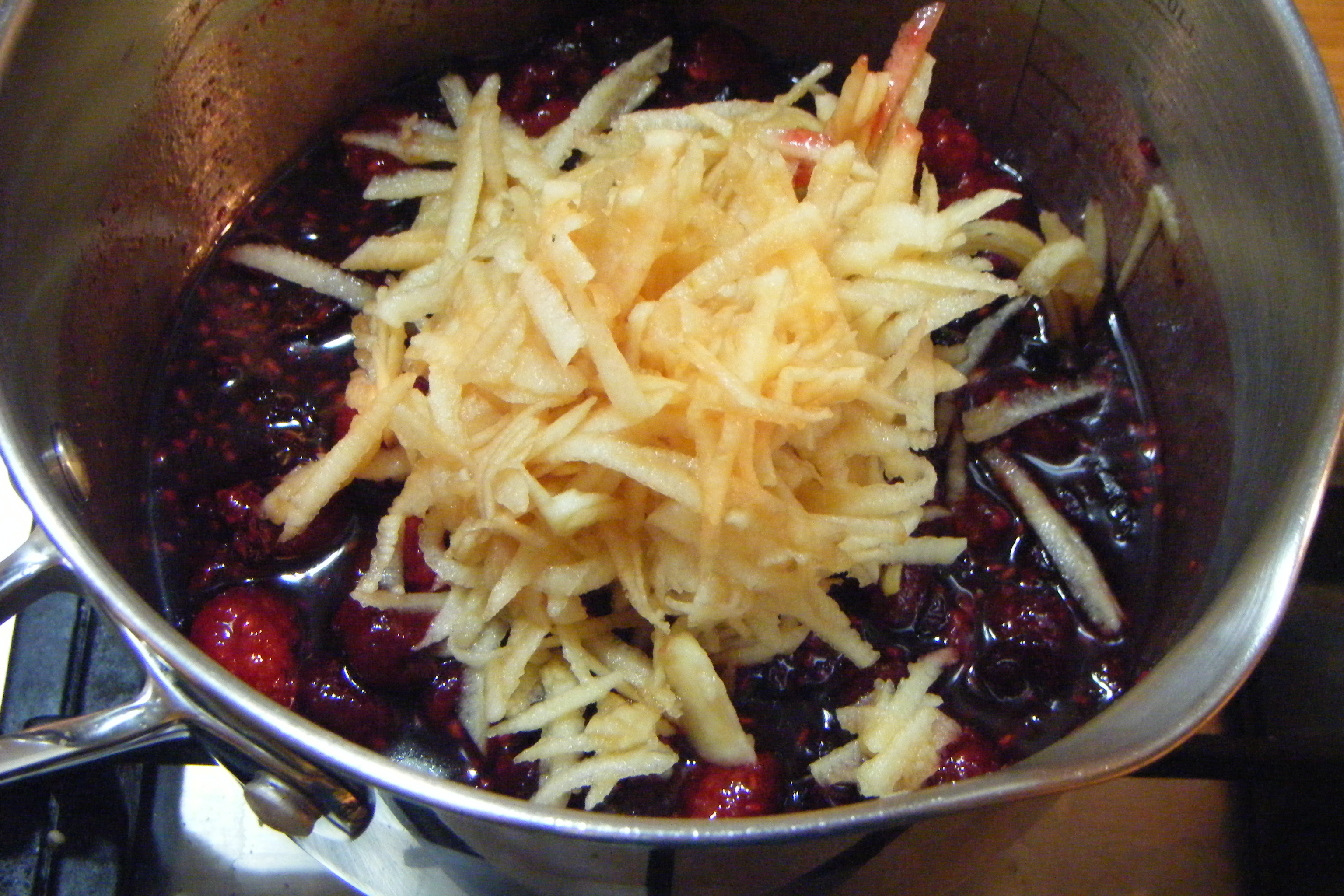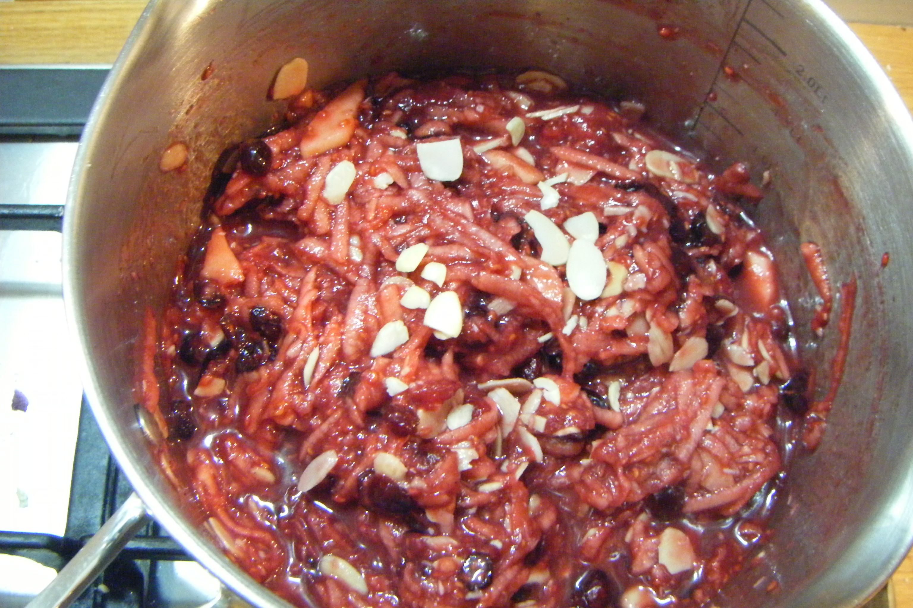 Meanwhile put the raspberries and sugar into a pan and heat gently on a low heat to melt the sugar, about 3 minutes. Once sugar is pretty much melted and the raspberries are softened, take off the heat and stir in the cranberries and grand marnier. Then add the apples and mix, then add in all the rest. Give it a good mix.