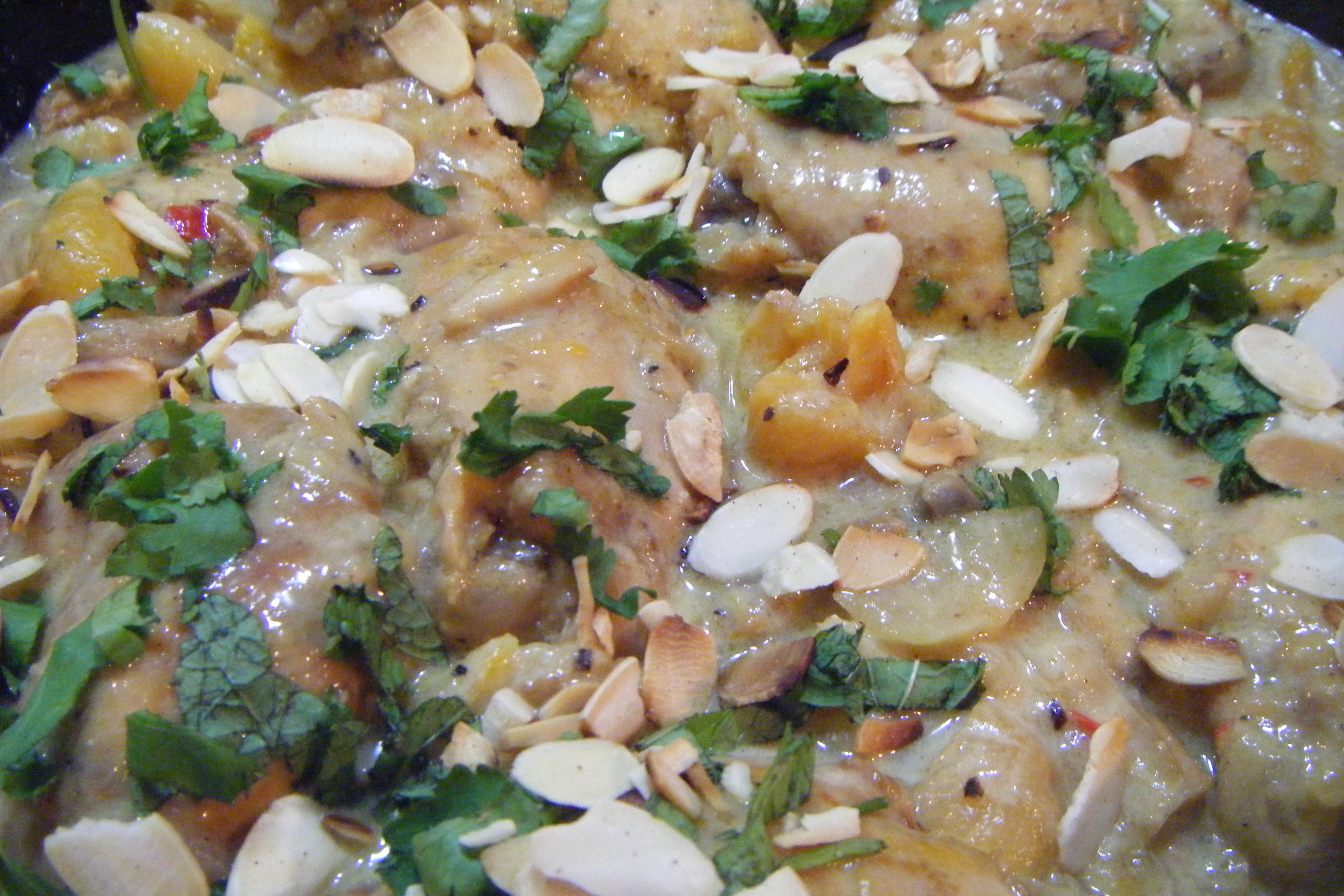 When the chicken is cooked, remove the chicken pieces from the sauce. Leaving the lid off, boil the sauce for a few minutes until it becomes syrupy at this stage if you like it creamier, add 2 tablespoons of natural yogurt. Replace the chicken to the dish and when ready to serve, sprinkle with the coriander and mint and some toasted flaked almonds.