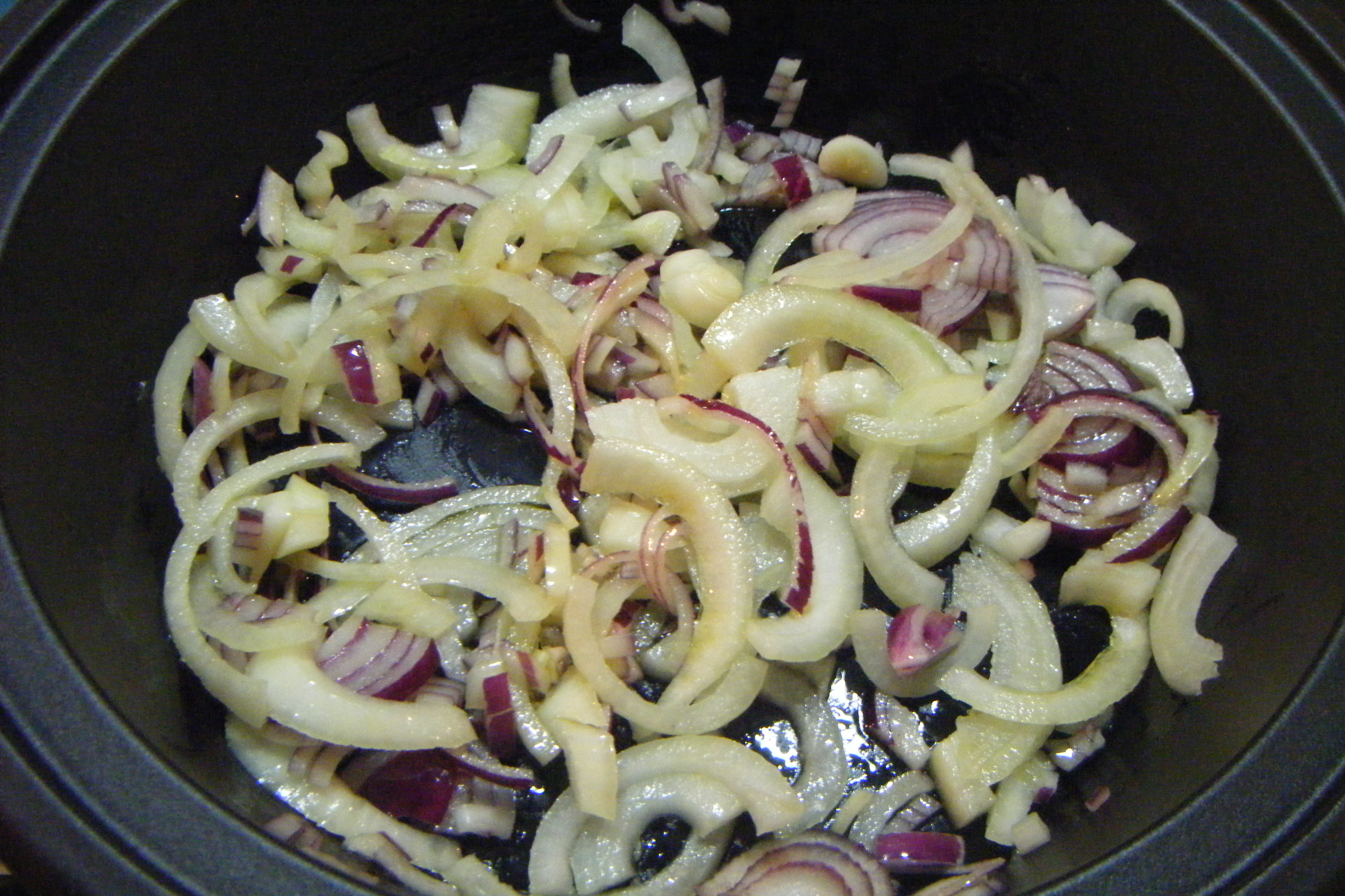 When ready to cook, heat the oil in the tagine base over medium heat on the hob. Add the onion and fry gently until it is just beginning to brown; remove from the pan.