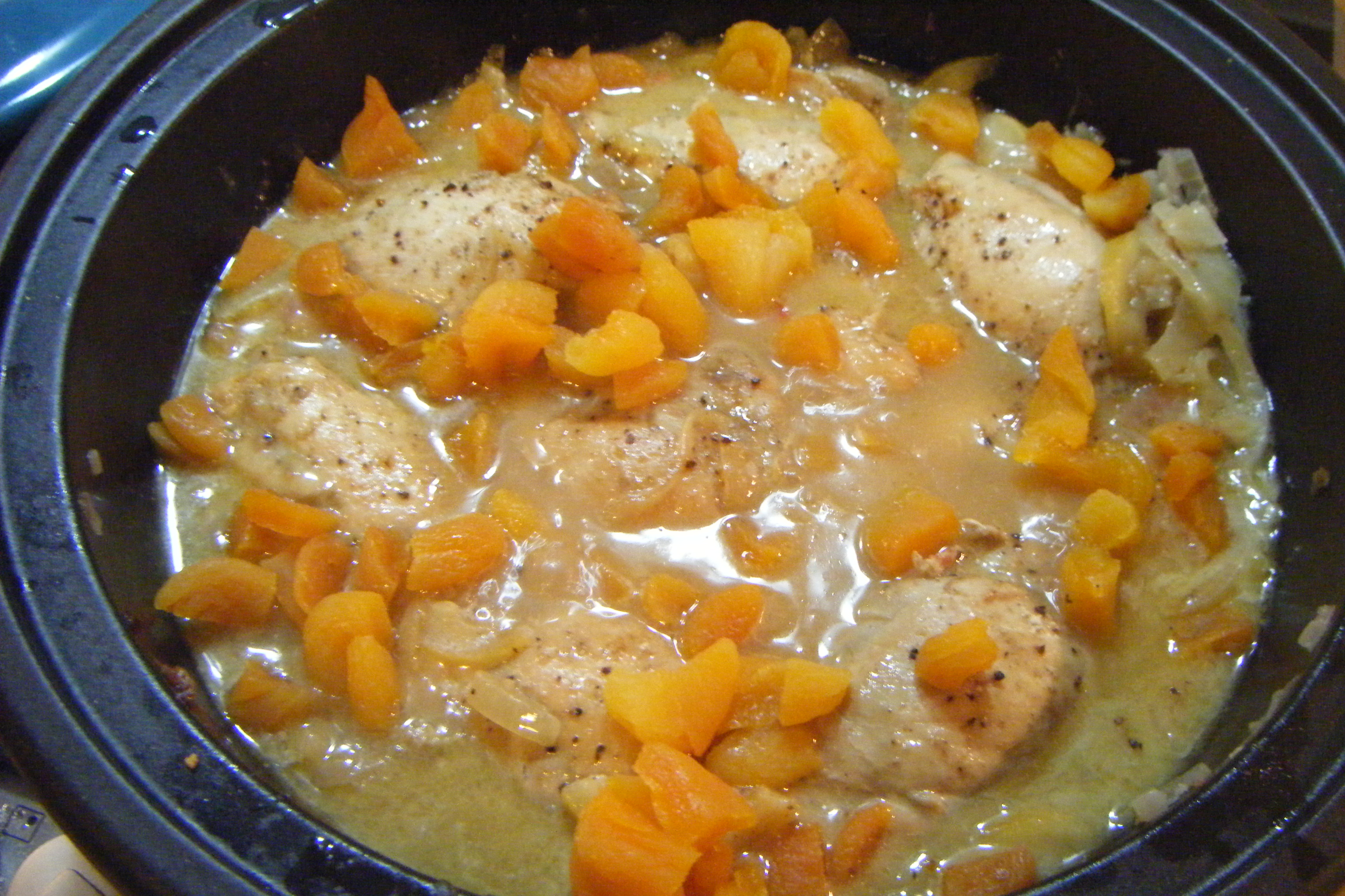 Add the apricots, re–cover, and continue simmering for 1.5 hours until the chicken is cooked through and tender.