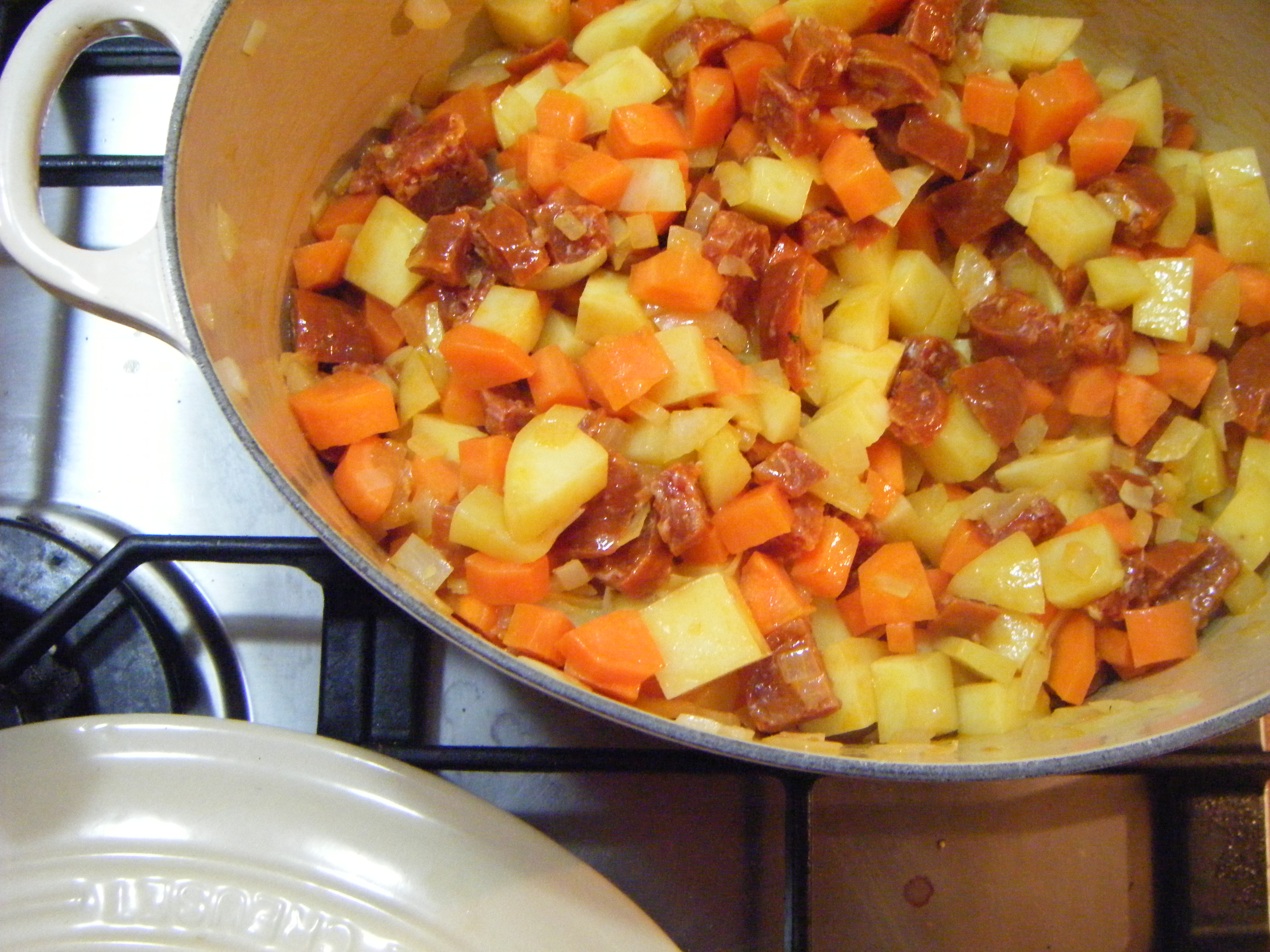 Heat the oil and butter in a large saucepan or casserole dish saucepan or casserole dish. Gently fry the onion over medium heat for about 5 minutes. Add the potato, carrot and garlic and cook for another 5 minutes. Add the chorizo, stir and cook for a few minutes until the oils from the chorizo start to break down and coat the mix with a lovely yellow hue.