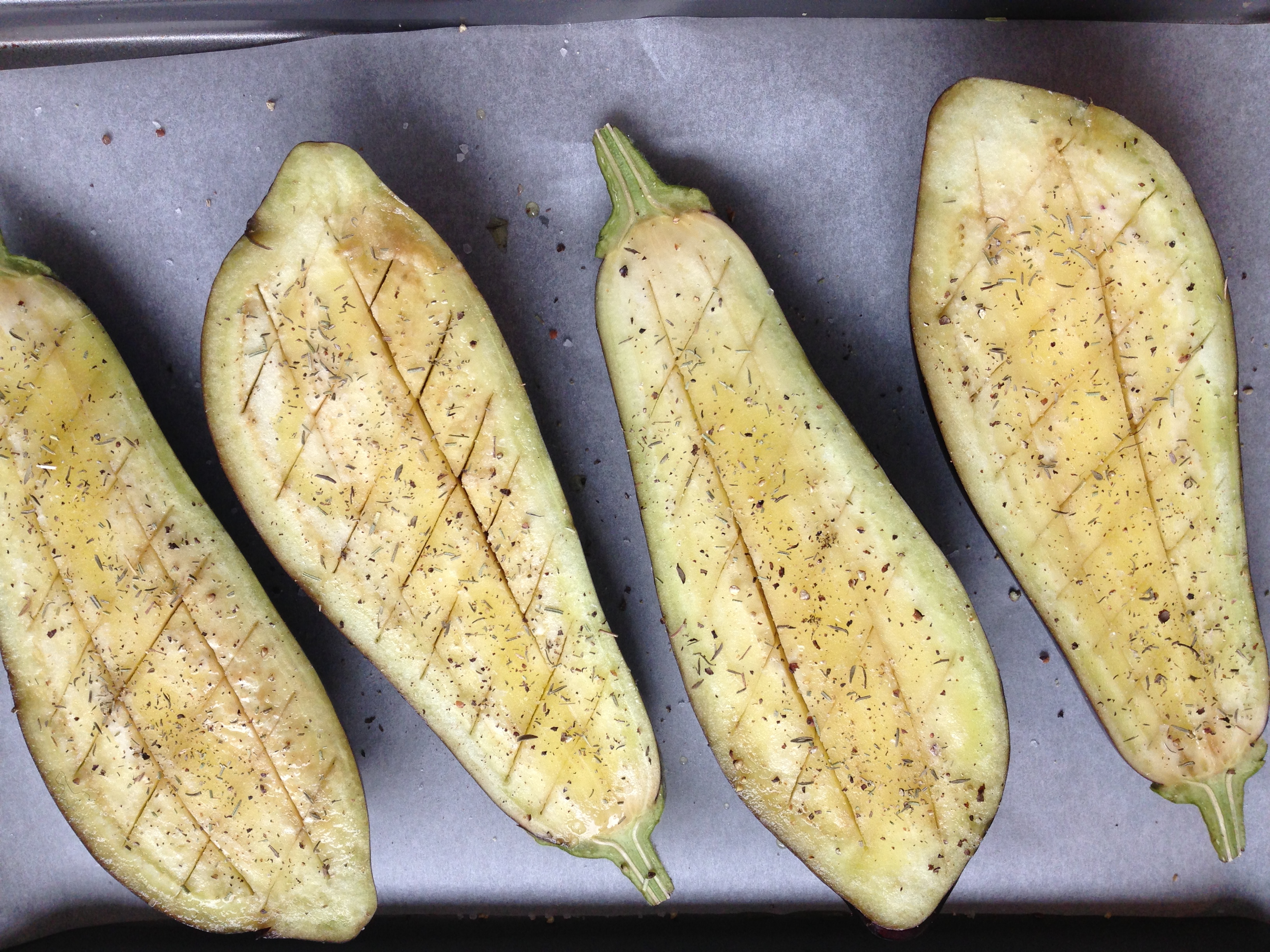 Preheat the oven to 180 C (fan oven). Wash the aubergines and cut them in two length ways through the green stalk ( don’t eat the stalk). Make three deep parallel incisions in the cut side of the aubergine, taking care not to cut as far as the skin. Then, at an angle to these cuts, make more slits, to create a diamond pattern.