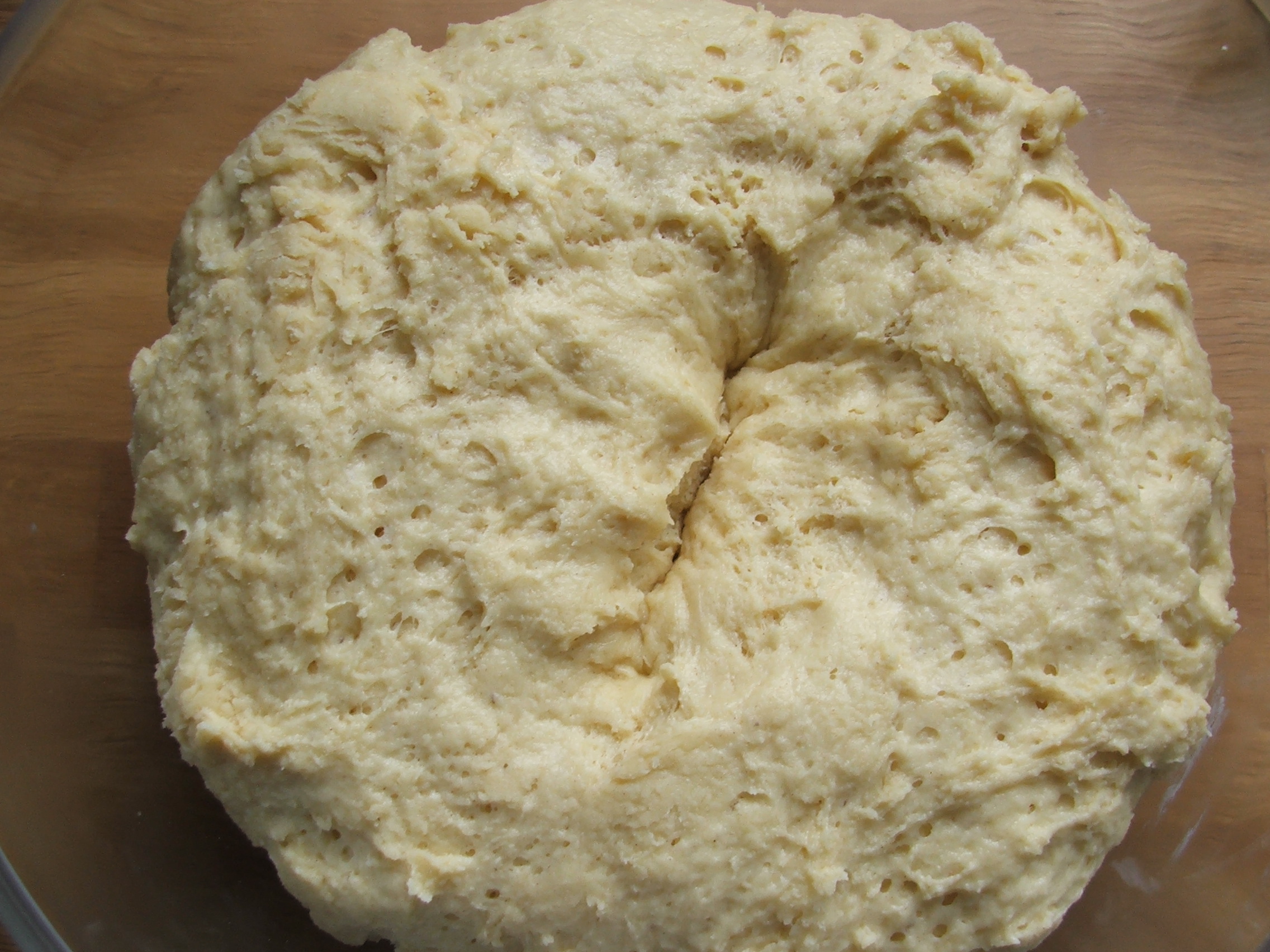 Gradually add 2/3  of the flour, mixing well. If dough sticks too freely to the spatula, add the remaining 1/3 of flour. Cover dough with plastic wrap or a kitchen towel and let rise until doubled in a warm place, about 2 hours. Punch down dough and allow to rise a second time until doubled, about 1 hour.