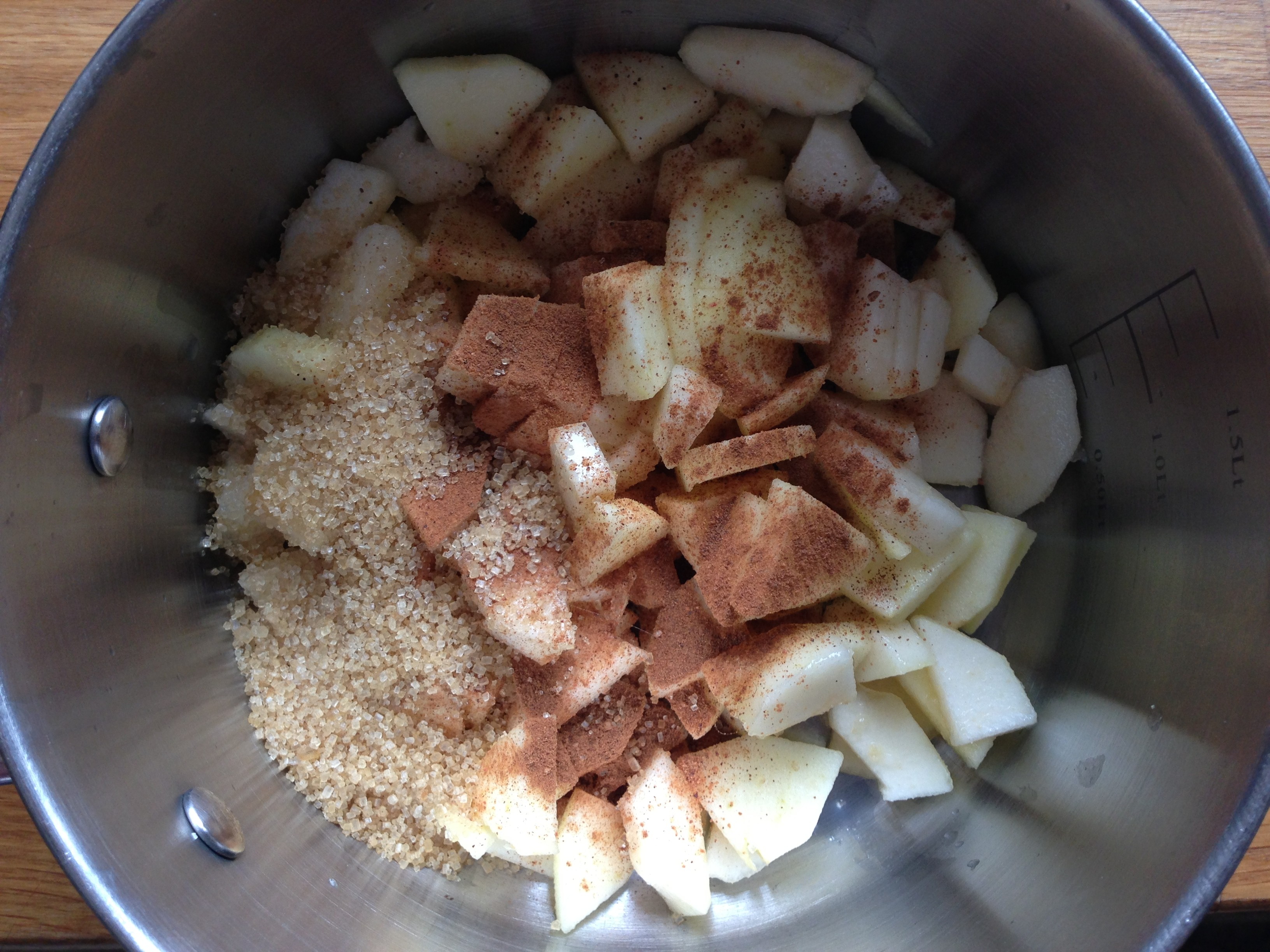 When the dough is nearly done with it’s second rise, pre heat the oven to 170°c (fan oven) or 190°c (non fan). Put your apple, pear, spices, sugar and lemon juice into a saucepan and simmer over a medium heat until the apple is less crunchy and the juices become slightly thicker, about 10 minutes.