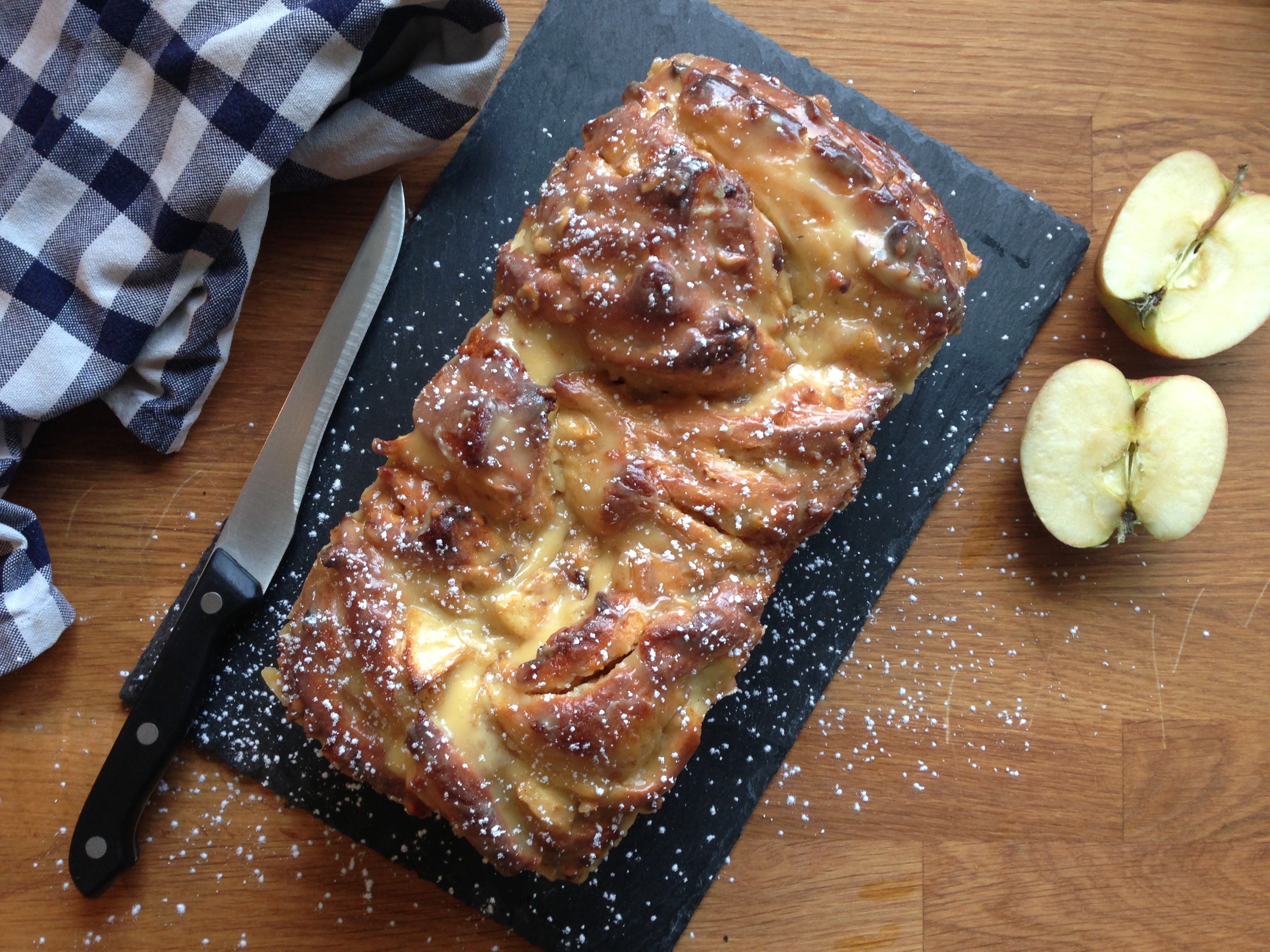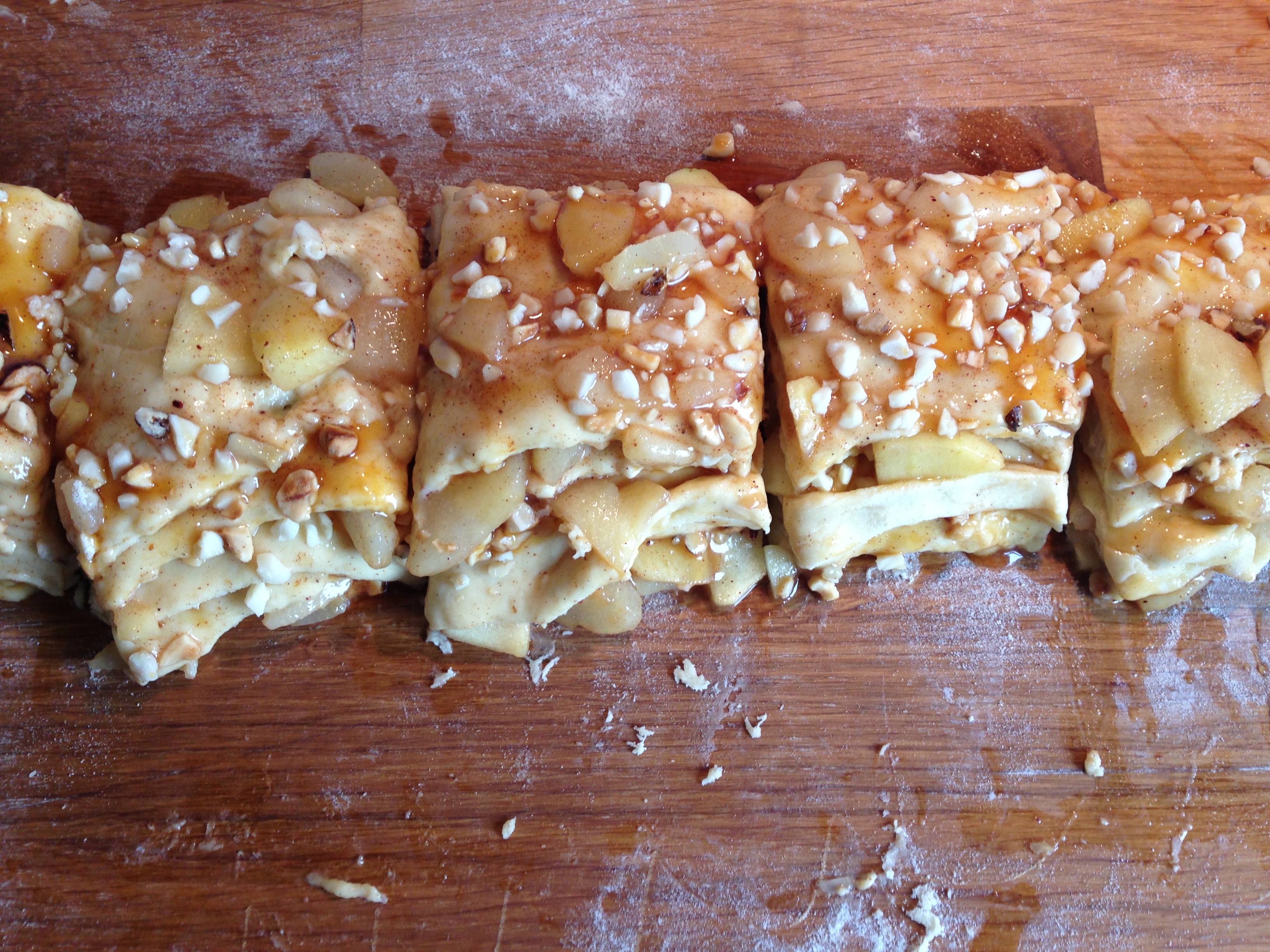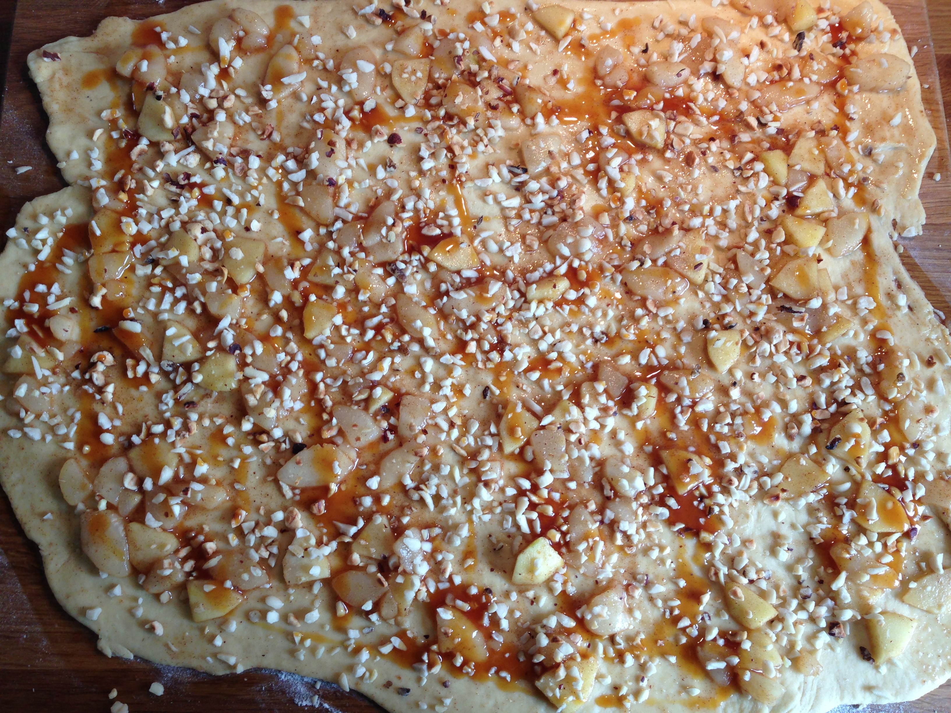 Spread the apple mix onto the rolled out dough. Sprinkle the toasted hazelnuts on top and drizzle the caramel sauce lightly over it.