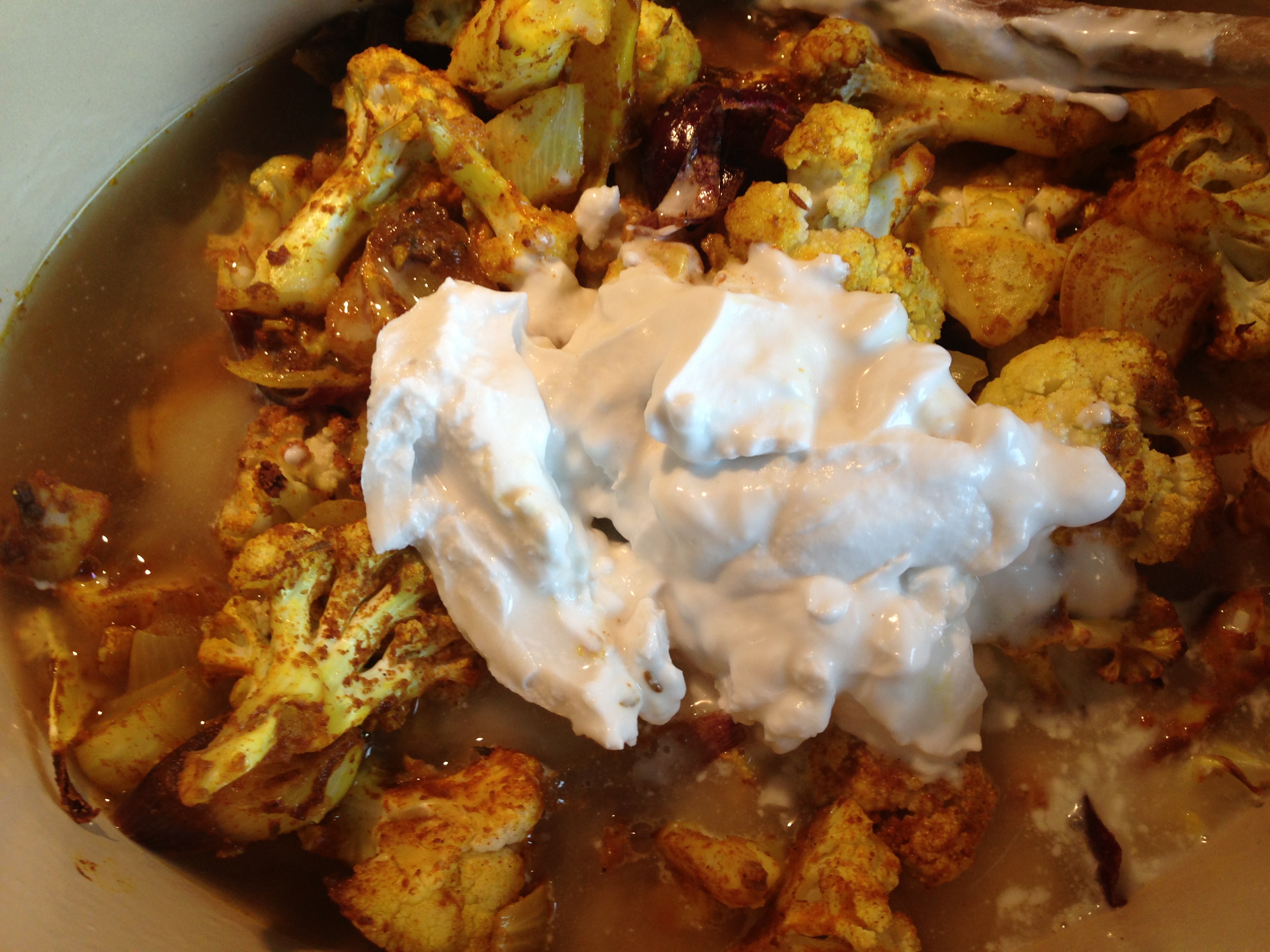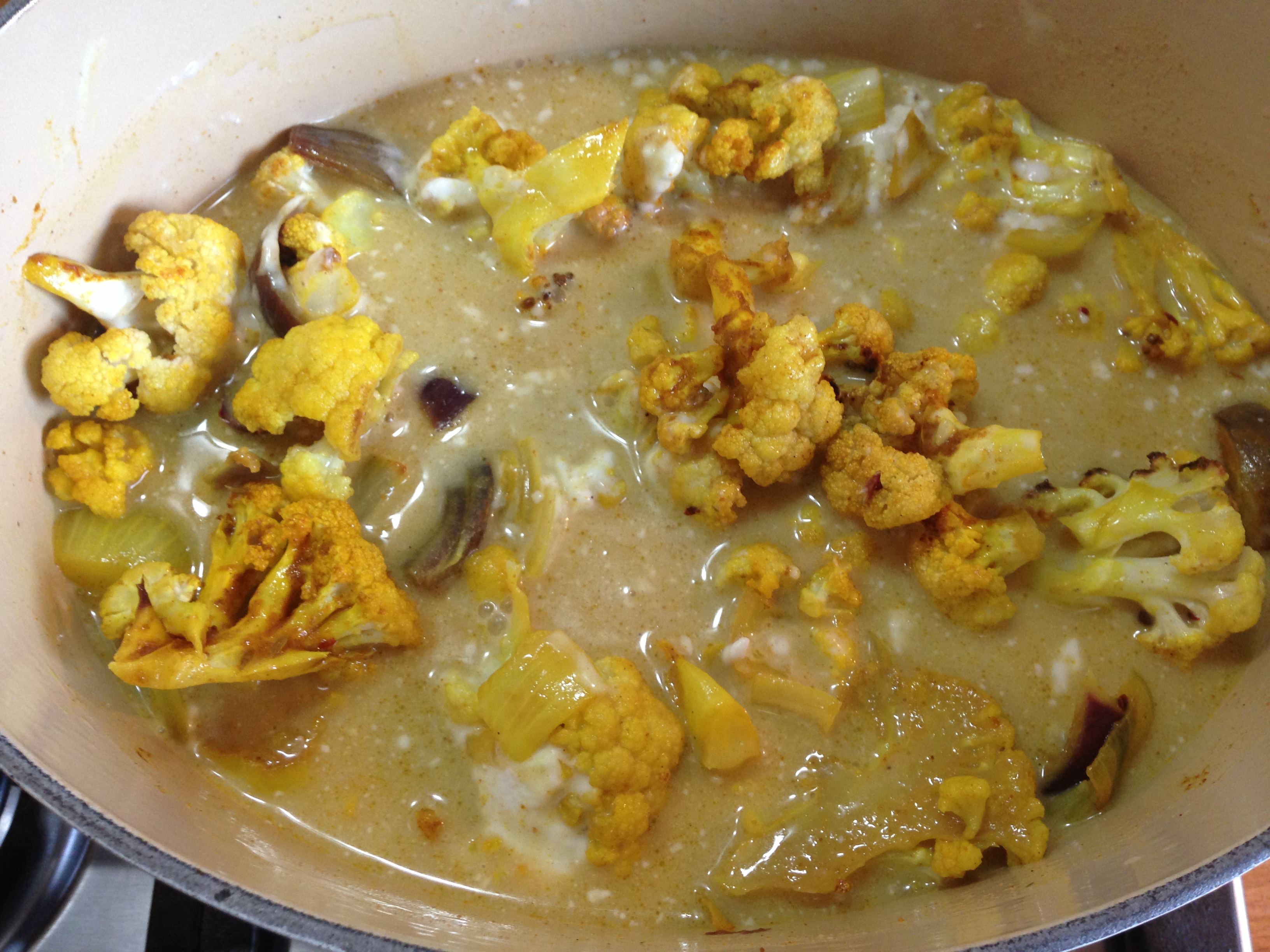 Cut or tear the cauliflower into florets, it really doesn’t matter what shape they are as long as there roughly uniform in shape. Cut the onions into big chunks and place the onion and the cauliflower in a roasting dish. Add oil and mix. Sprinkle the spices on top and gently mix just to coat the cauliflower. Pop this into the oven for 15 minutes just to help soften the vegetable and to bring out the flavour of the spices.