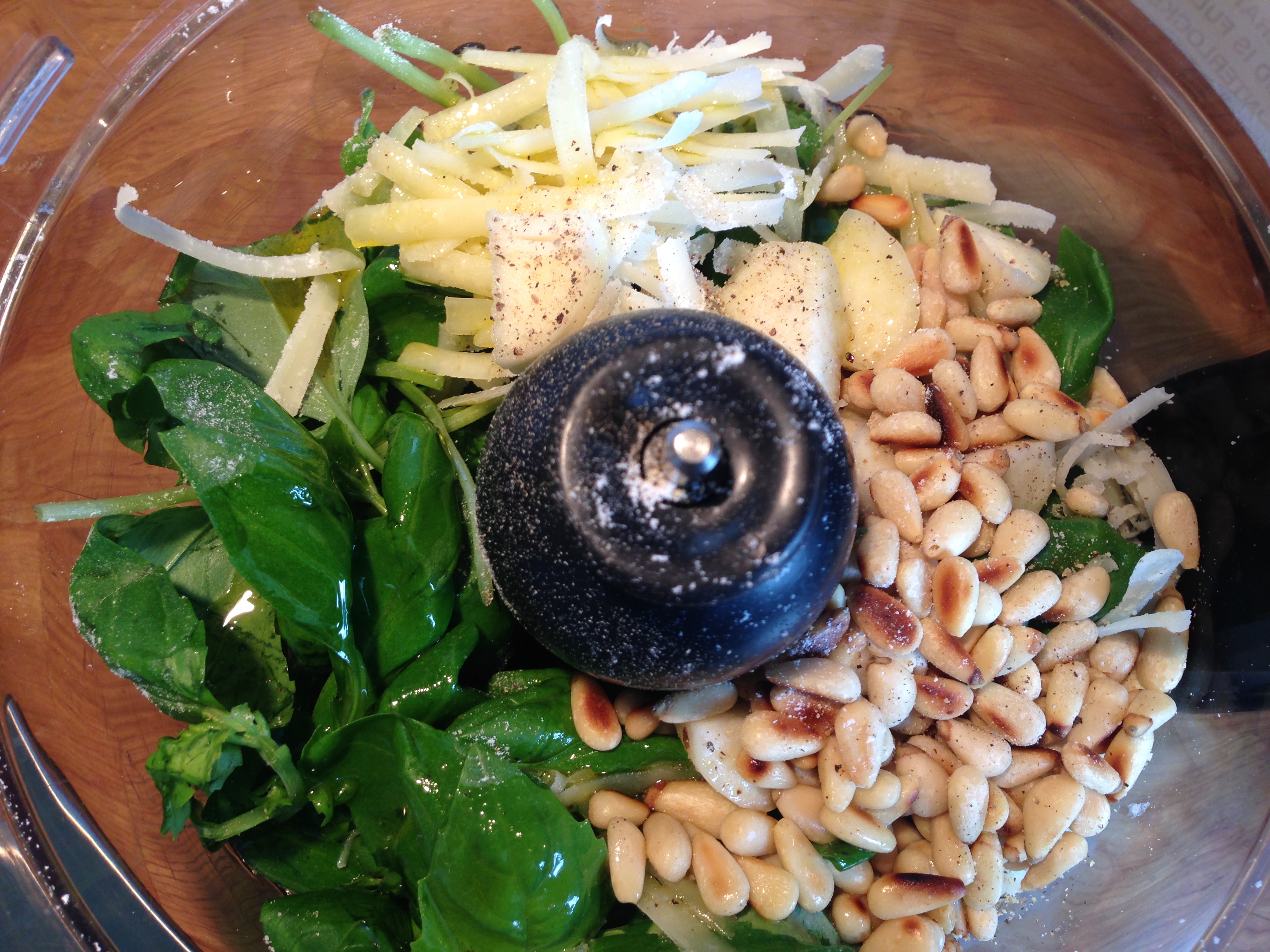 Place the basil, 20 g of the pine nuts, garlic, oil and 40 g of the parmesan into a blender. Season with salt and pepper. Don’t add too much as the basil and parmesan add spice and salt to it. Whizz it up (roughly 30-40 seconds). Make sure to scrape down the sides of the blender as chunks can cling to the side.
