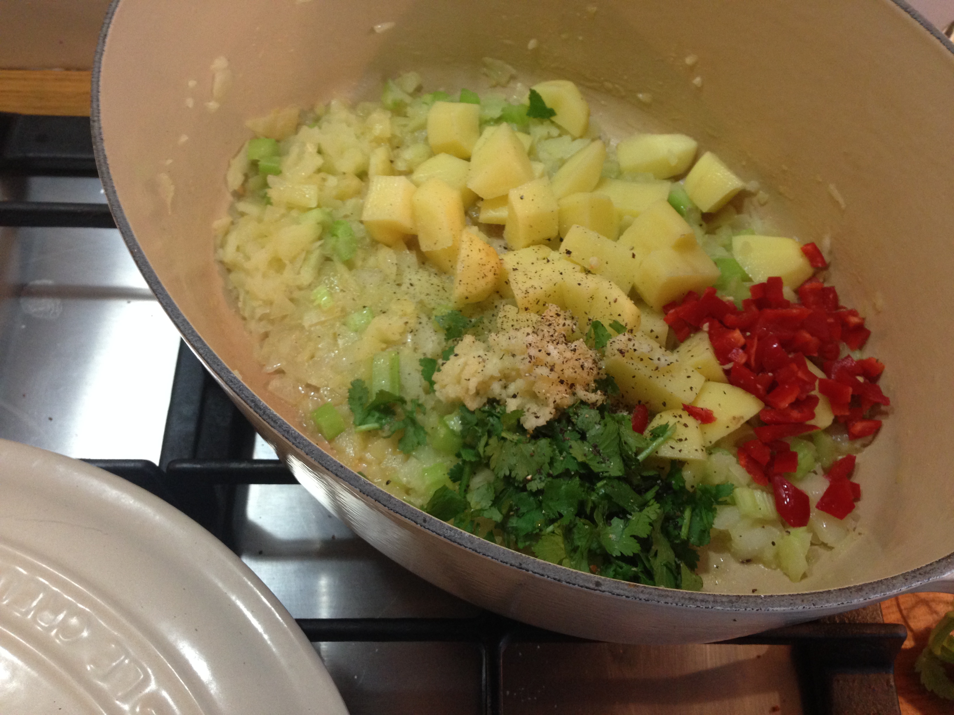 Then add in the chilli, potatoes, coriander, garlic and some salt and pepper. Stir again.