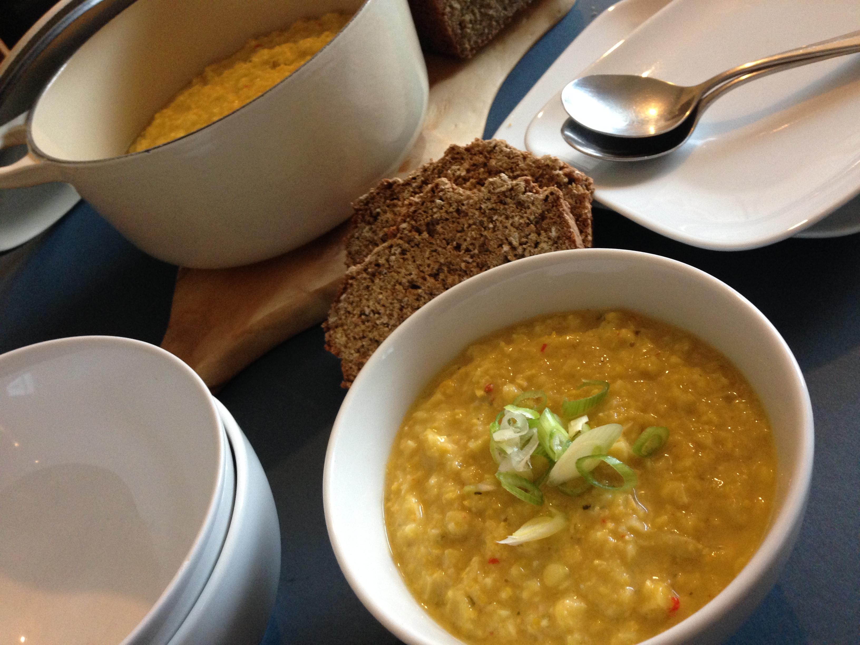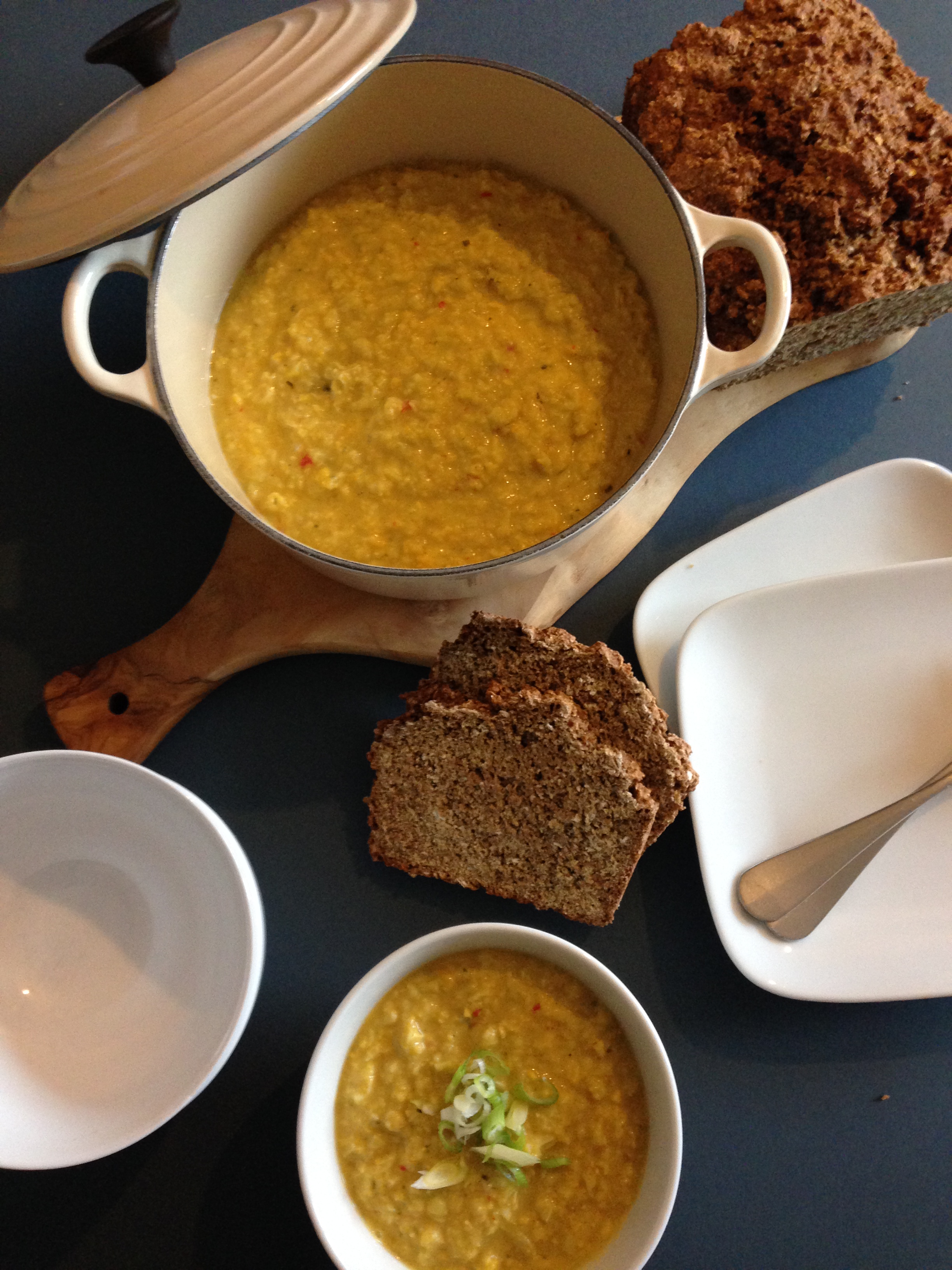 Obviously you can make the soup really smooth if you prefer. But I like the flecks of red from the chilli and the odd whole corn kernel in it. Actually feels like you are eating something, rather than just drinking soup. Delicious served with a home-made brown bread (my mother kindly made us a loaf of her brown soda bread loaf which is divine).