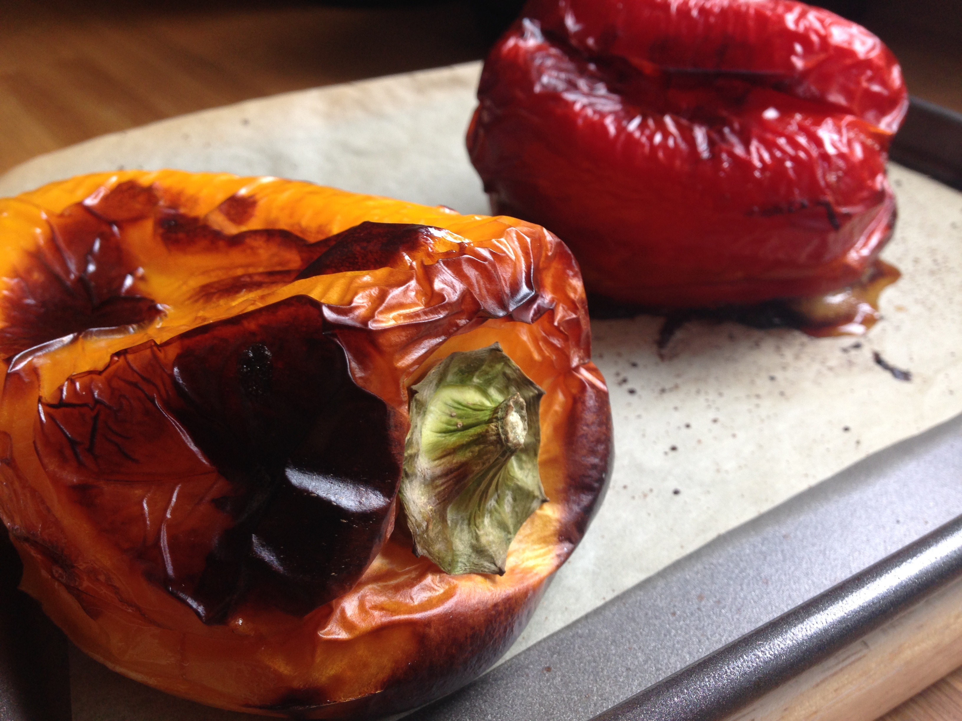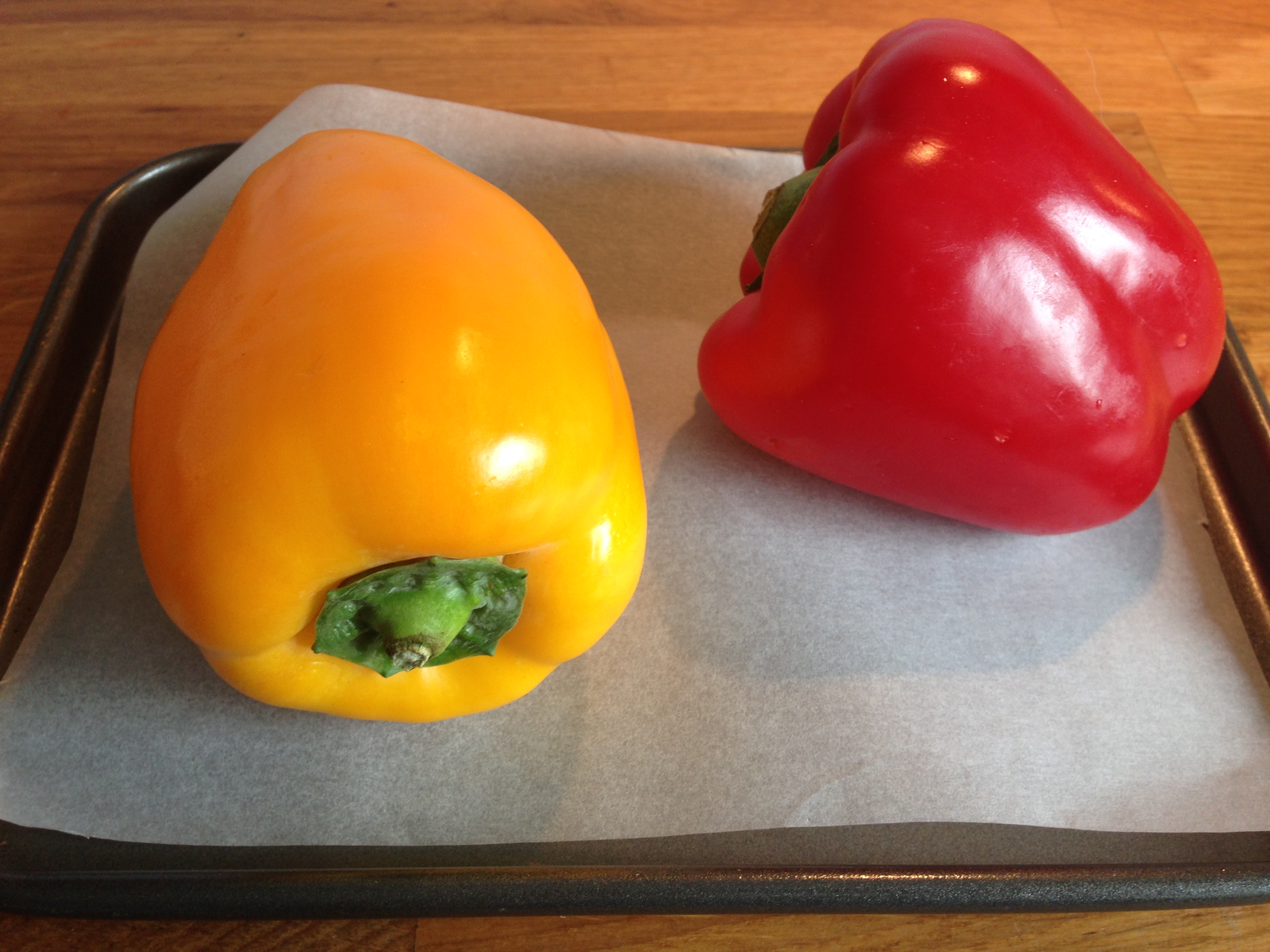 Heat the oven to 200 C/180 C fan oven. Place the peppers on a baking tray (I line mine with parchment to reduce the washing up). Pop into the oven and roast for about 30 minutes. Turn them every 10 minutes. They will blister and char. This is a good thing.