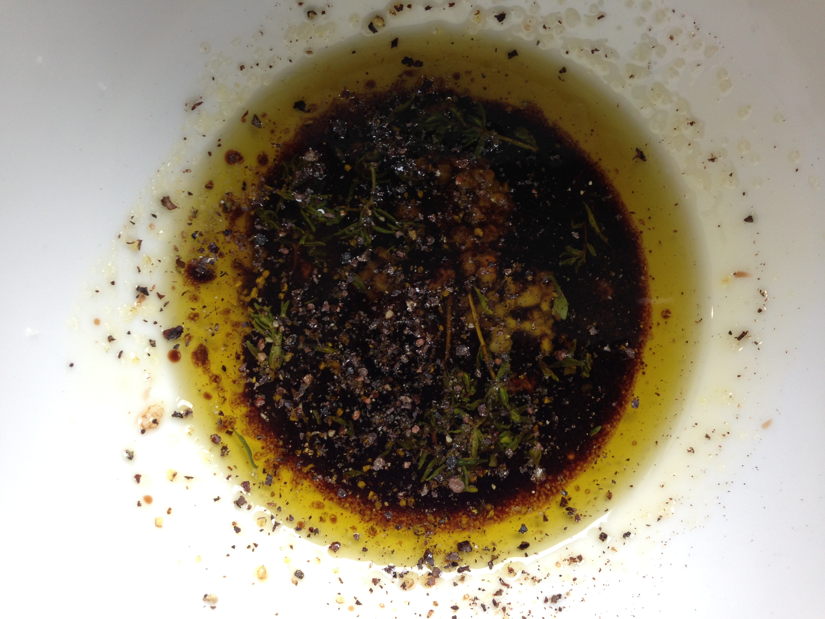 To make the dressing, whisk together the oil, balsamic vinegar, sugar, garlic, thyme leaves and some salt and pepper.
