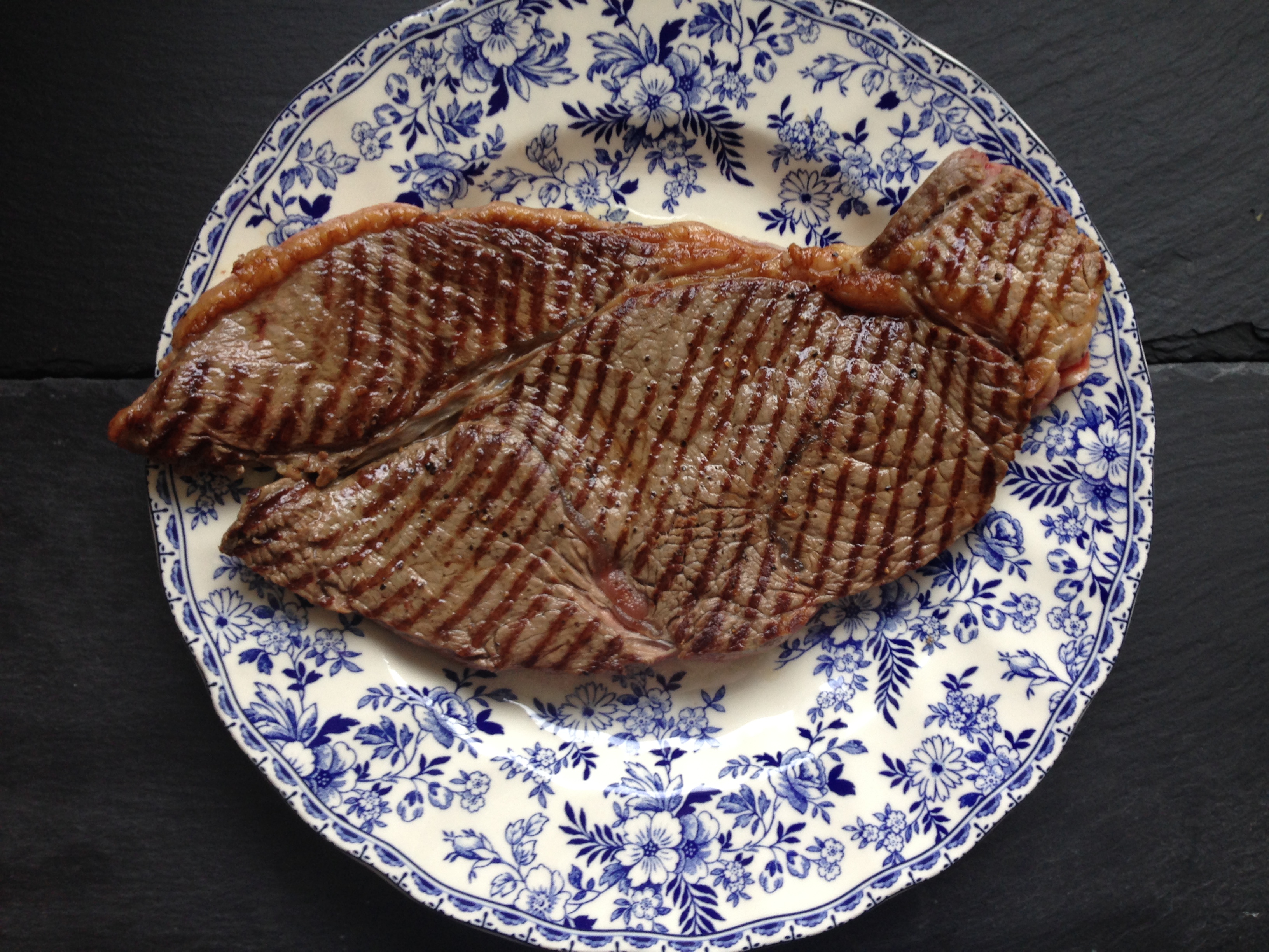Heat a griddle pan over a high heat. Spray a little oil on the pan. Season both sides of the steak and pop onto the griddle pan. Cook for about 5 minutes per side for medium-rare. Remove from the heat and rest for 5 minutes.
