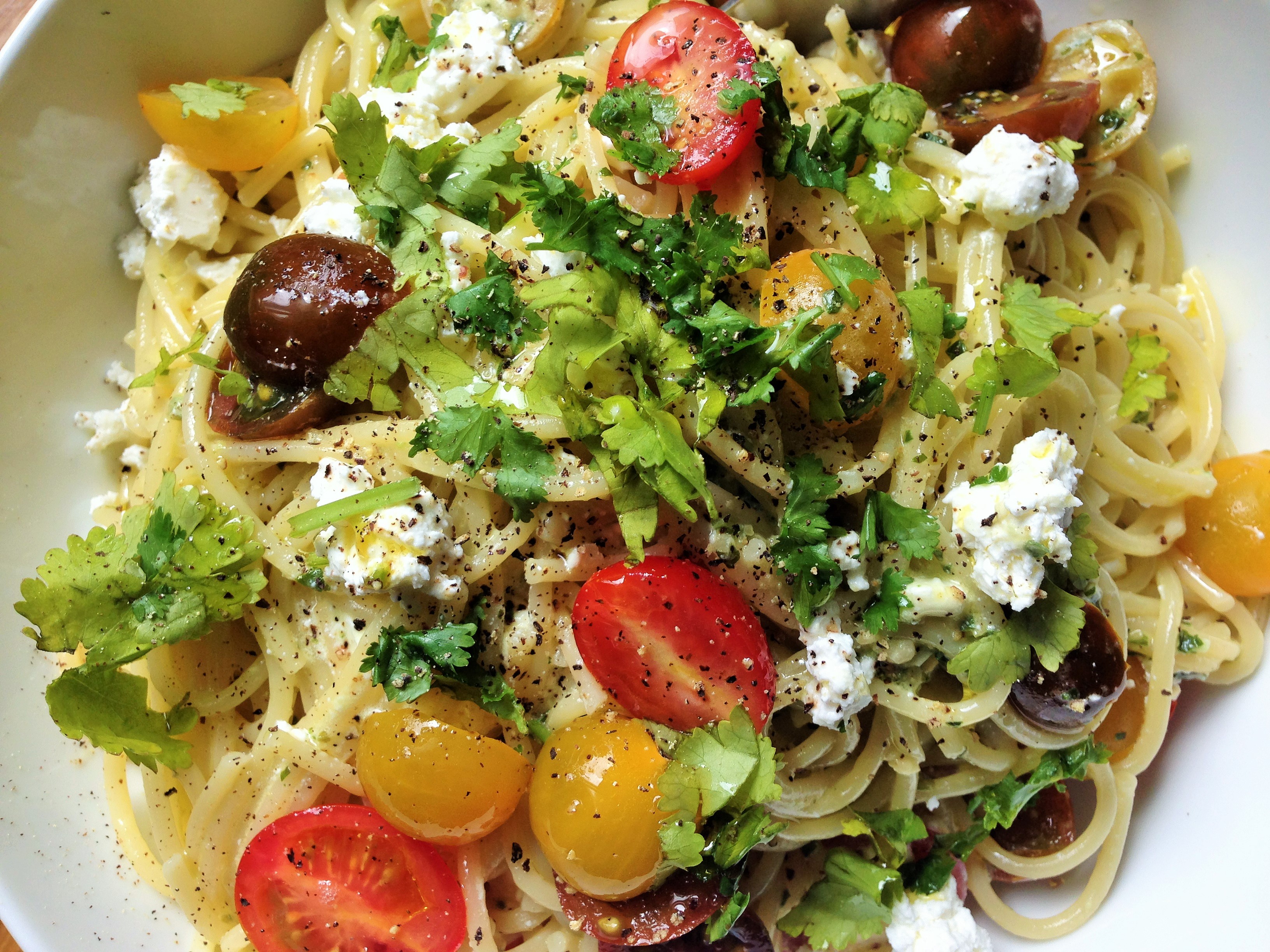Drain the spaghetti, but reserve a little of the cooking water as this gives the basis to the sauce. Return the spaghetti to the pot and add 1-2 tablespoons of the pesto, a little of the reserved water (about 1 tablespoon) and 1 tablespoon of olive oil and give it a good stir to coat the spaghetti evenly. Add half of the cut cherry tomatoes and half the feta to the pot and stir again. Pour into a serving bowl and scatter the remaining cherry tomatoes, feta and chopped coriander to the top. Drizzle with olive oil and add a good grind of black pepper. And dig in!