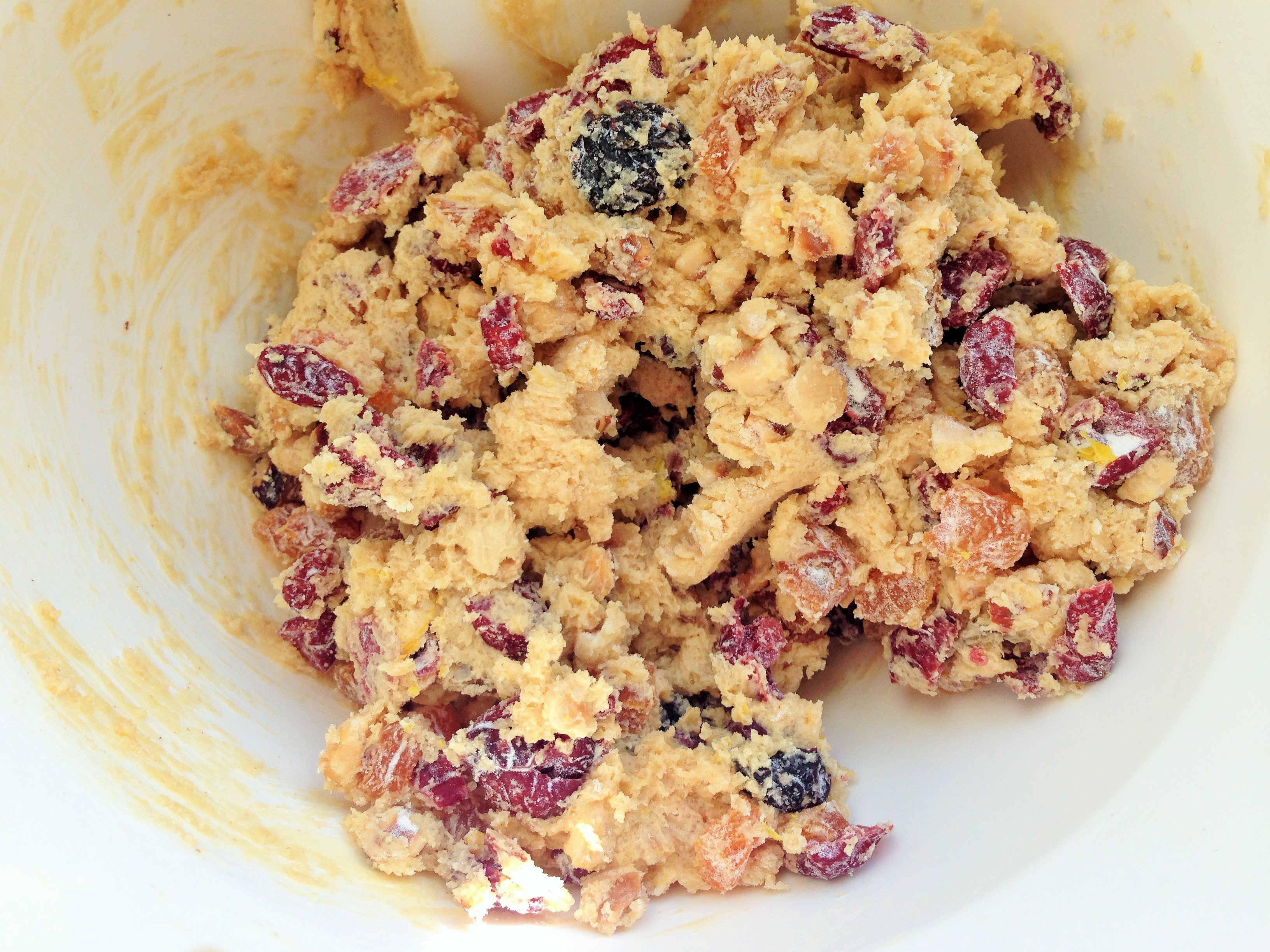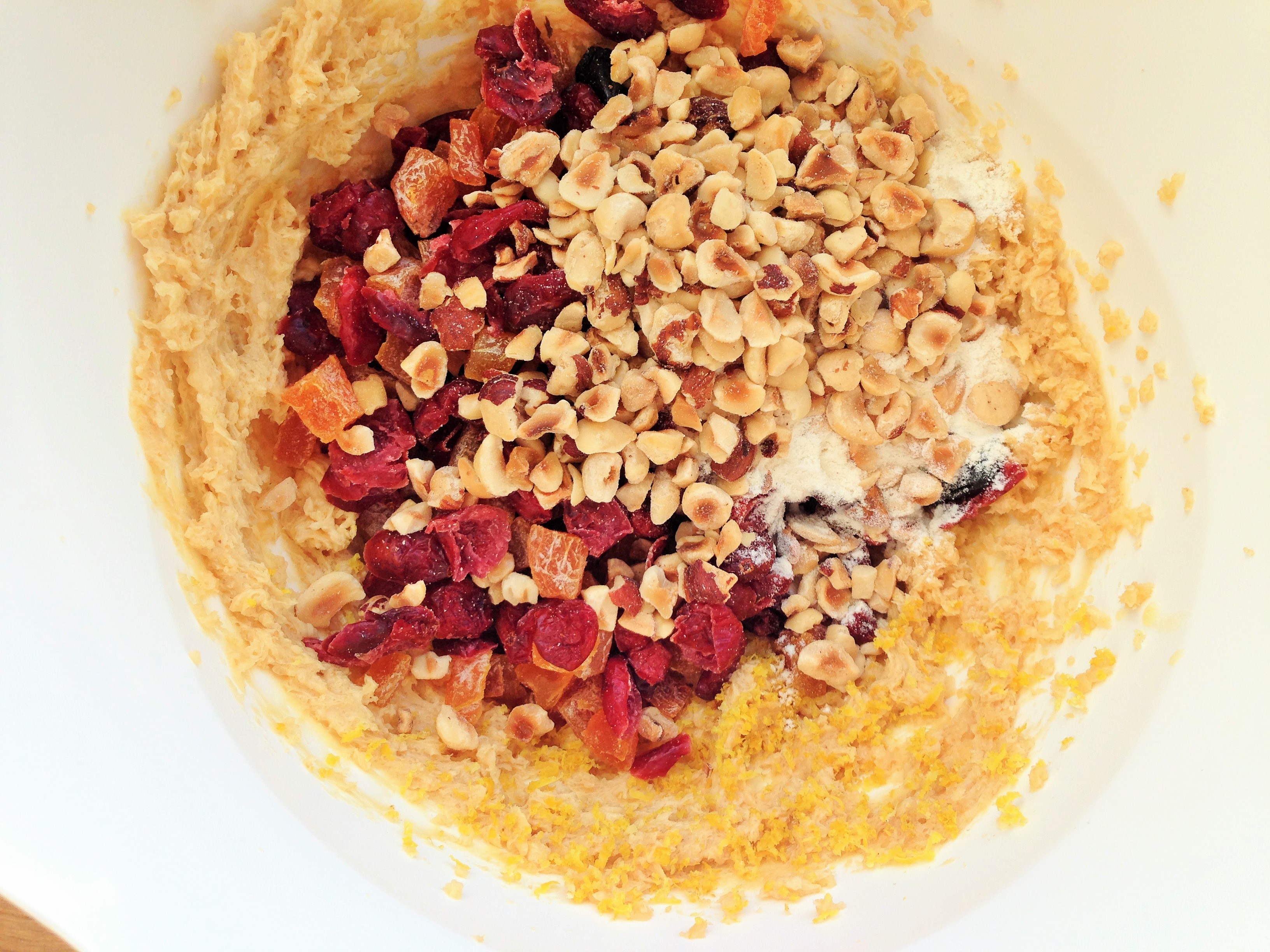 In a mixing bowl, cream the butter and muscovado sugar until fluffy. Mix in the dried fruits, flour, lemon zest and hazelnuts and stir until well combined.