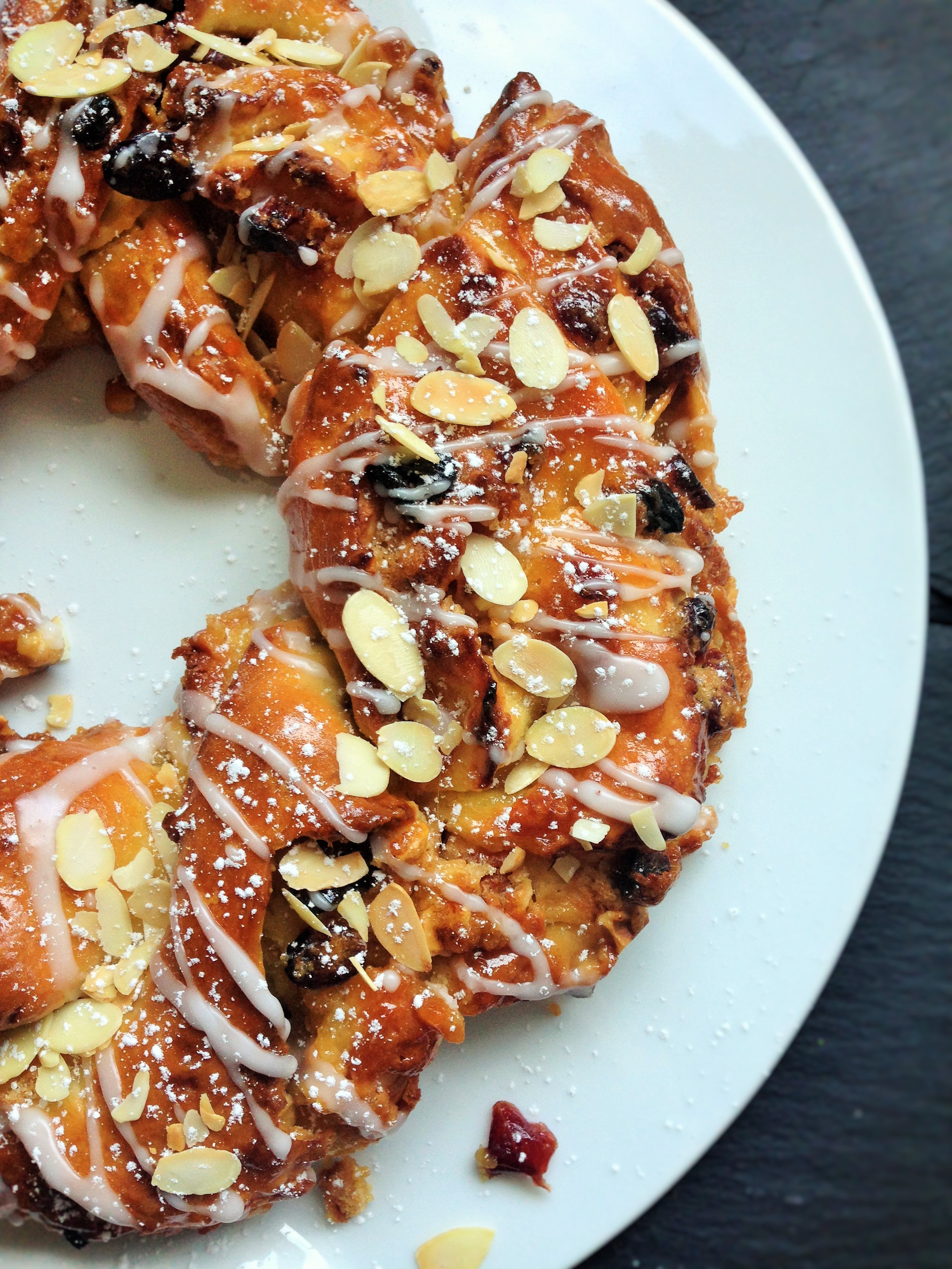 When I was living in London at the ripe old age of around 10 years old, we lived opposite a delicatessen called Elizabeth Kings in Fulham, and every Saturday my mother and I would head across and buy some weekend treats. I now vividly remember the ‘Couronne’ which I would spend ages choosing (based on nuttiness and the amount of glaze that adorned on top of it). This bread is quite similar to what we all know as the Babka. It is a yeasted sweet bread, studded with fruit and marzipan and traditionally made in a round wreath like shape. It too is a celebratory bread but originates from France. I would get one of these every Saturday and reluctantly let anyone share in the explosion of flavour you got once it hit your mouth. I had totally forgotten this memory and this bread until a few weeks ago when in the last week of my pregnancy, I suddenly had a craving for it. Thankfully my mother was able to help me remember what it was called.