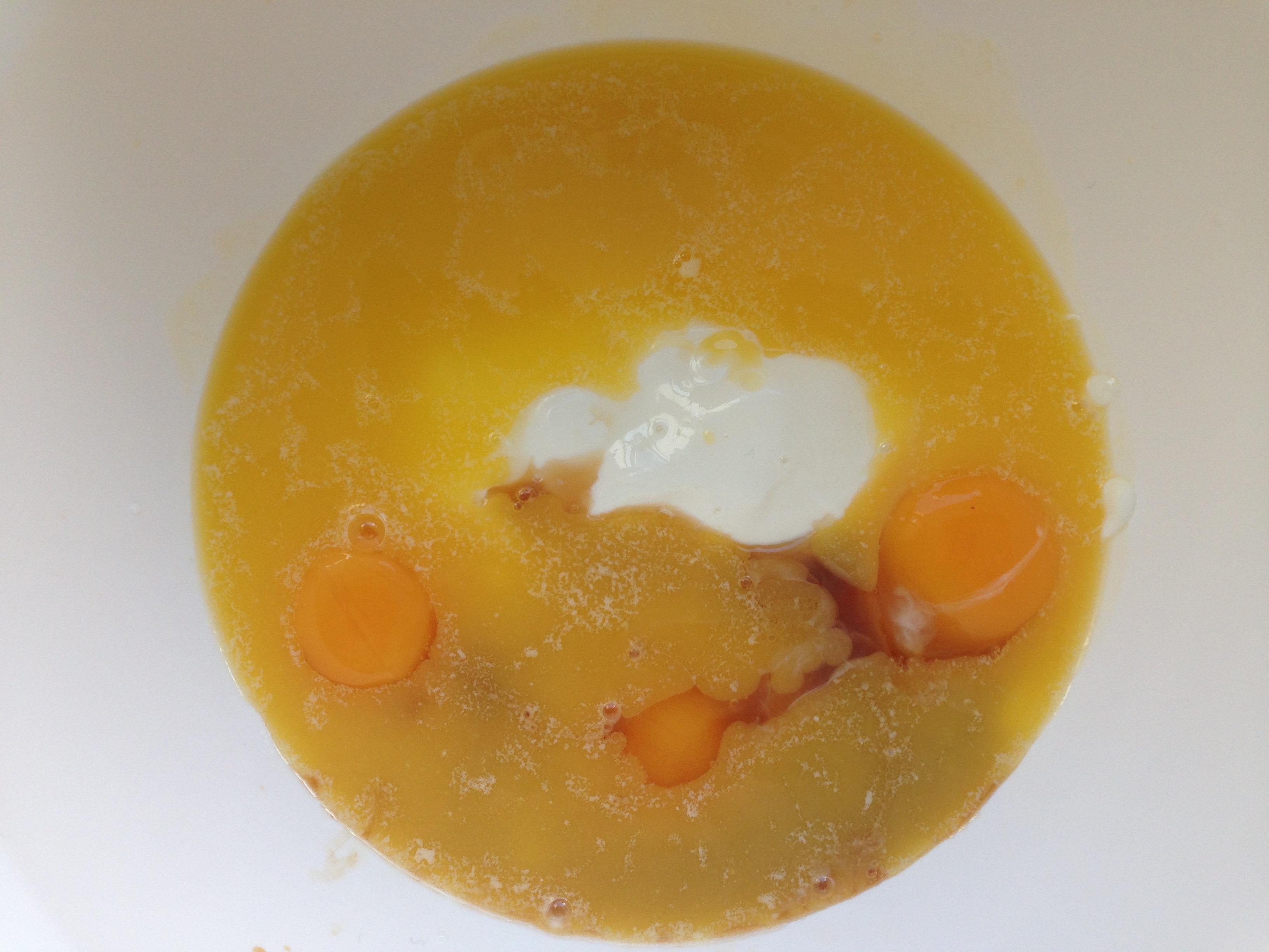 In a large bowl, whisk the yogurt, eggs, vanilla, almond and butter together.