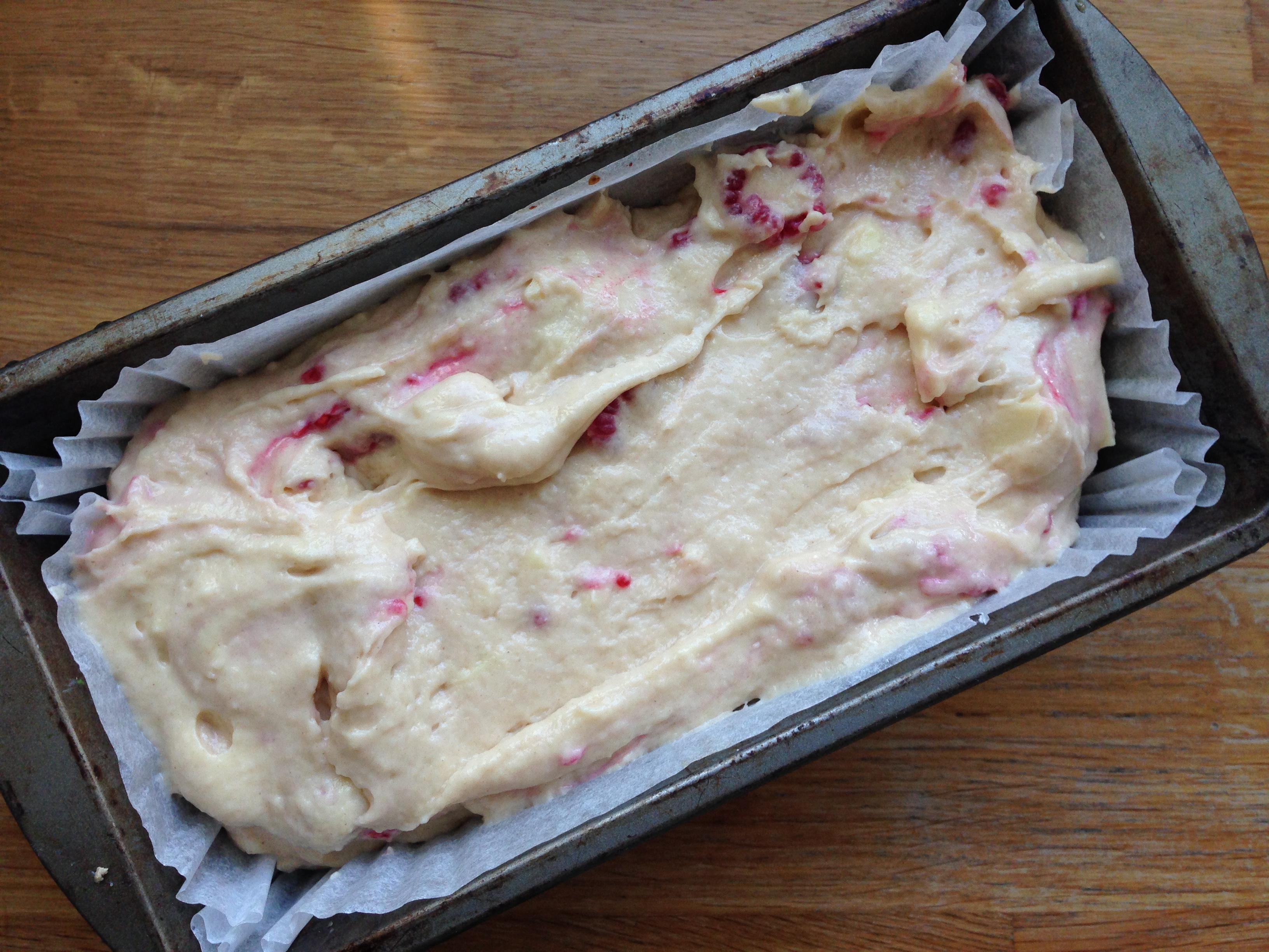 Gently fold the flour mix into the wet ingredients. Then fold in the raspberries and white chocolate. Pour into the loaf tin and evenly flatten the top.