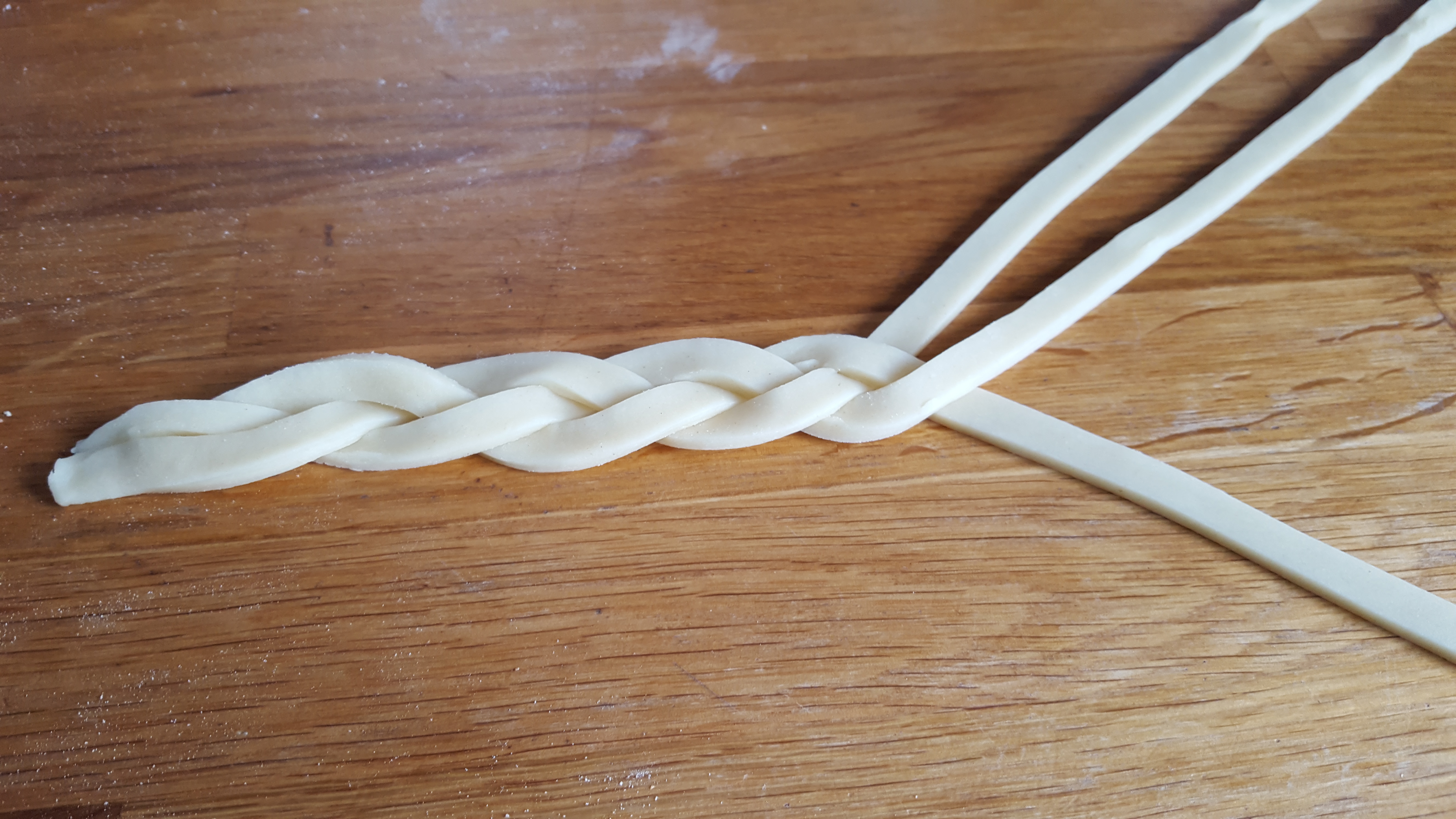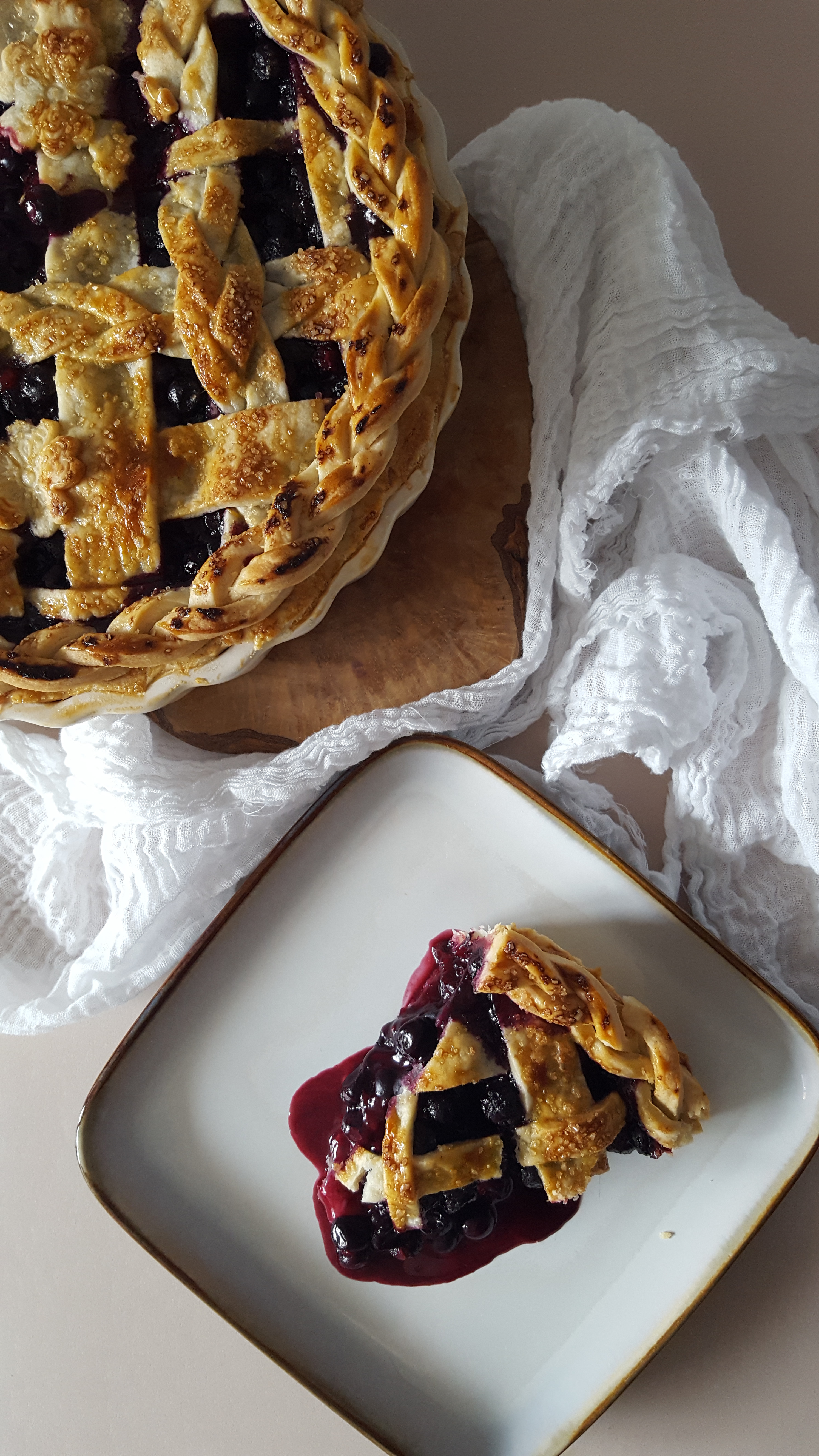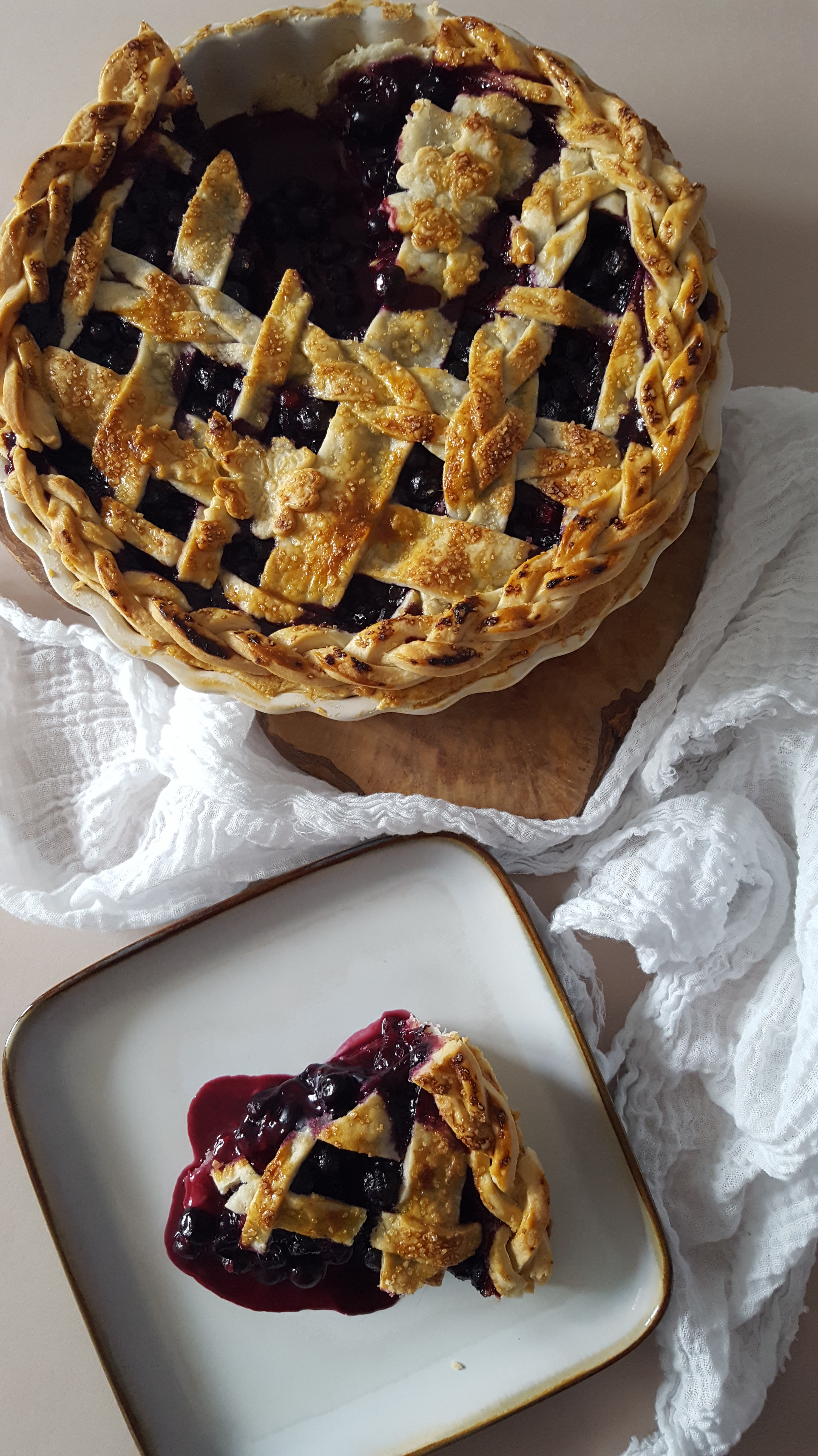 Next roll out the rest of the pastry, not too thin though (3-4mm).Remove the chilled lined pie dish  and pour your blueberries in and now start your top layer.  Now this is the part that is up to you. I chose a lattice top to my pie, some like to cut out shapes and adorn the top with leaves and flowers and some like to simply layer a flat sheet of pastry on top and makes little slits for air to release. Really the design is up to you, and there are just so many ways to decorate it.
