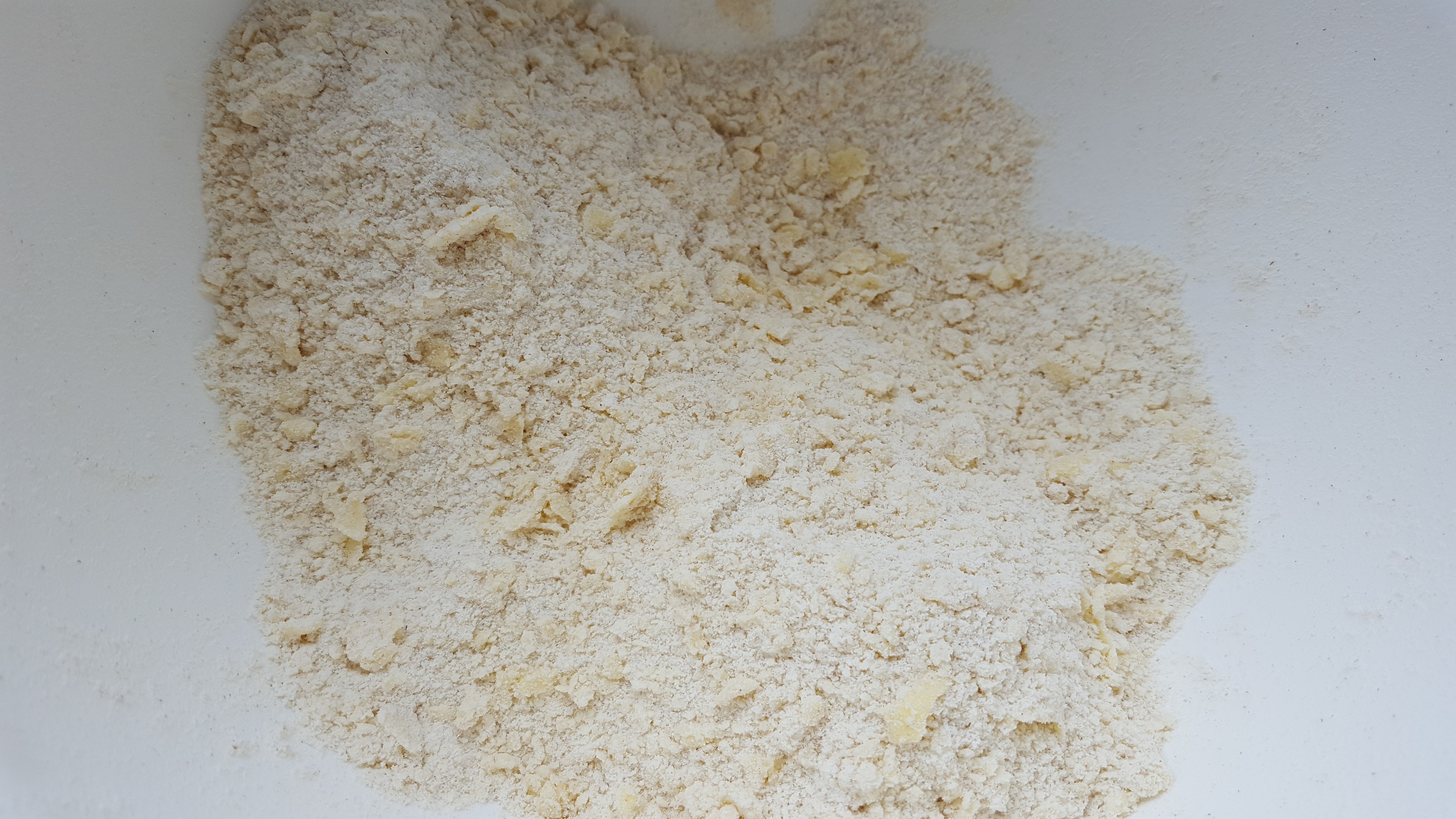 Sift the flour, salt and baking powder together in a large bowl. With your fingertips, rub the cubes of butter into the flour until you have crumb like pieces.