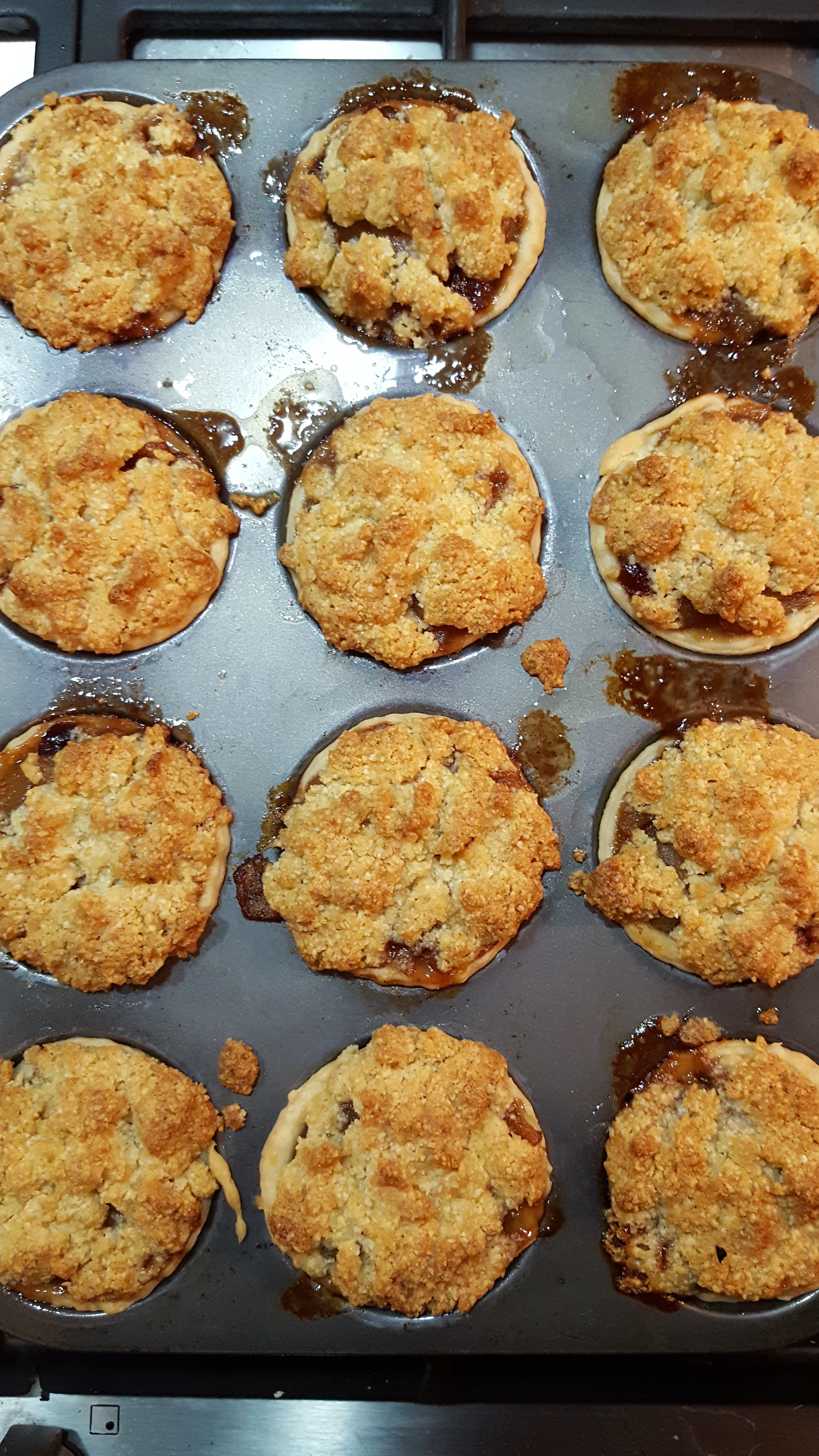 It is a wet crumble which makes it easier to eat when cooked. Press the crumble mix on top of the pies. Pop into the oven for 20 minutes, until golden brown and oozing sweet goodness.