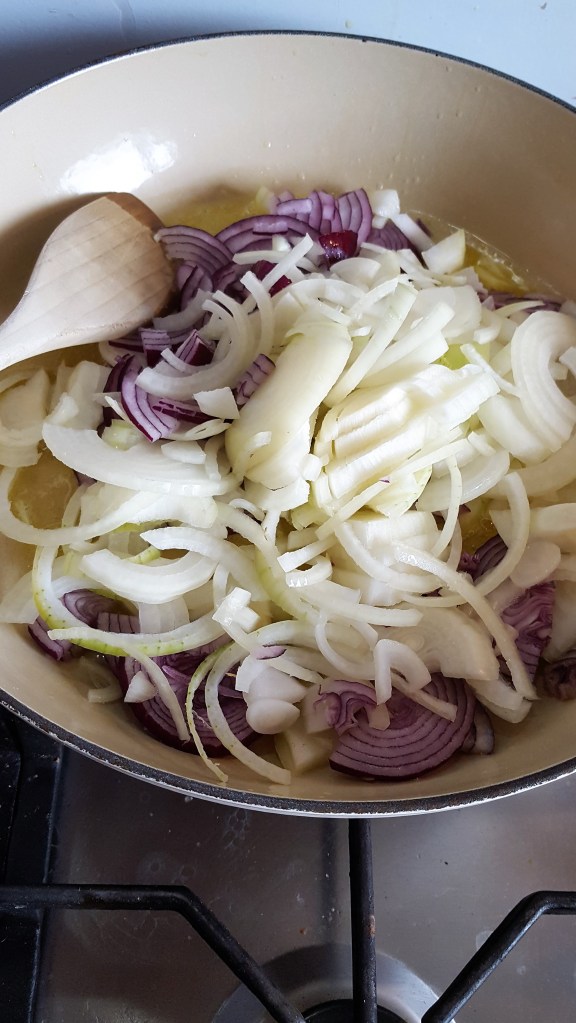 Add the onions and stir. Use a low heat as you want the onions to cook long and slow so not to colour or burn. Saute for about 20 minutes, keep stirring.