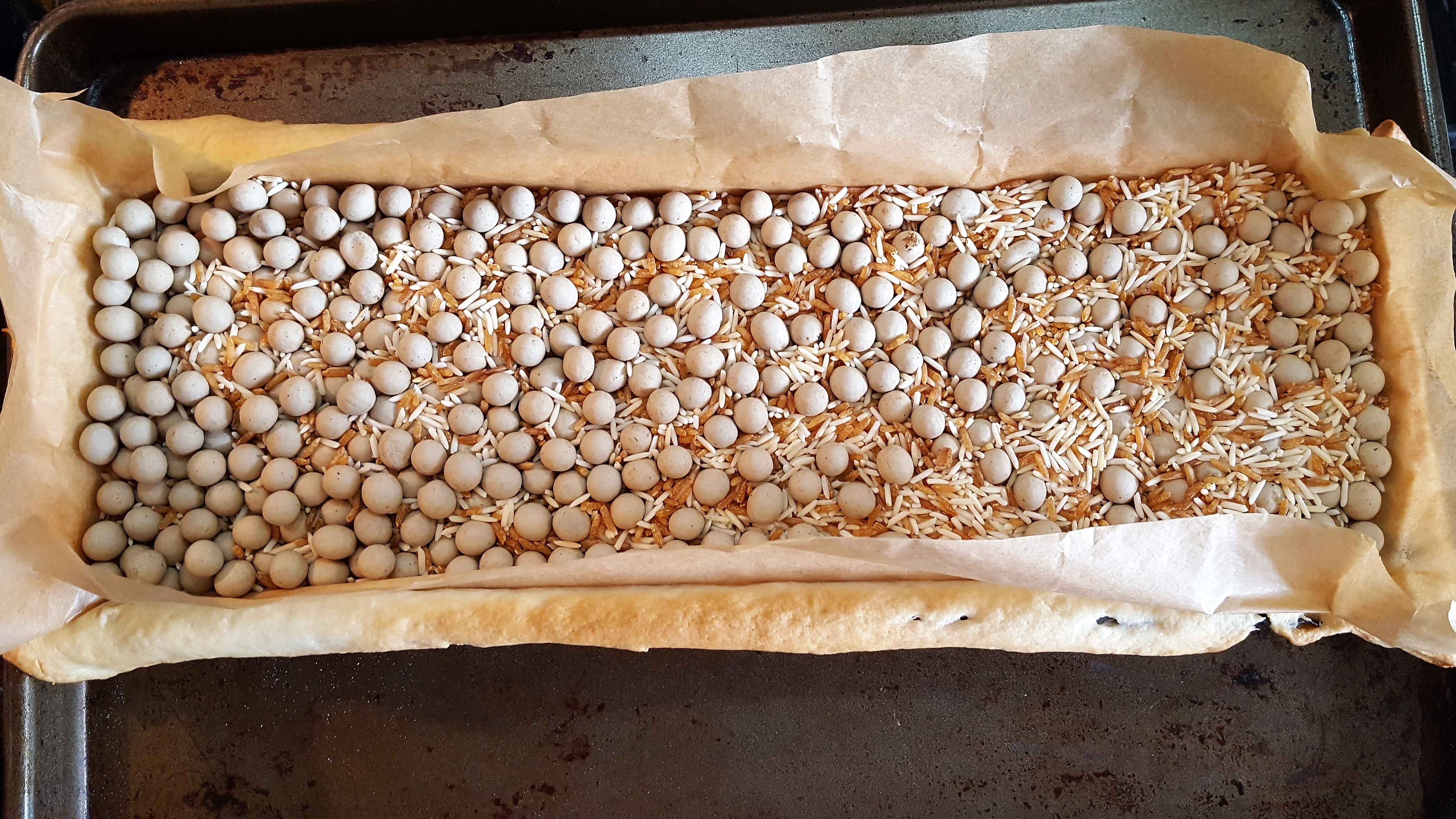 heat the oven to 190 C and line a tart tin with the pastry. I used a large shallow tin (13cm x 36cm). Prick the pastry with a fork , on top of the pastry line the tin with baking paper and using baking beans or rice or pulses, bake blind for 15 minutes. Then remove the beans and cook for a further 5 minutes. remove from the oven and allow to cool. turn the oven down to 170 C.