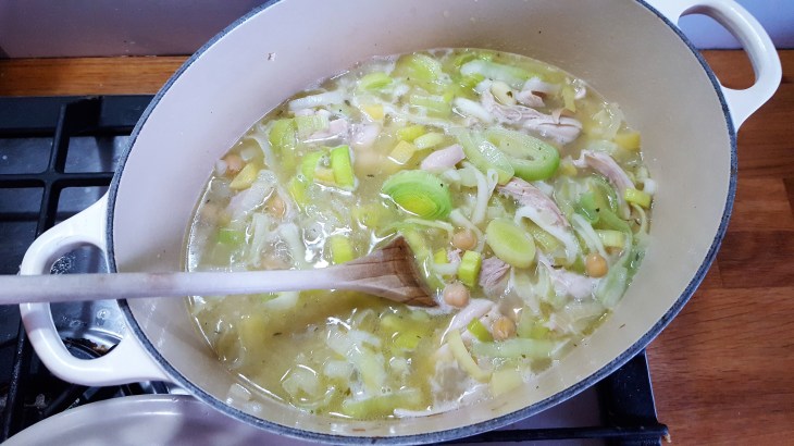 Add the stock and shredded chicken and simmer on a gentle heat for 20 minutes.