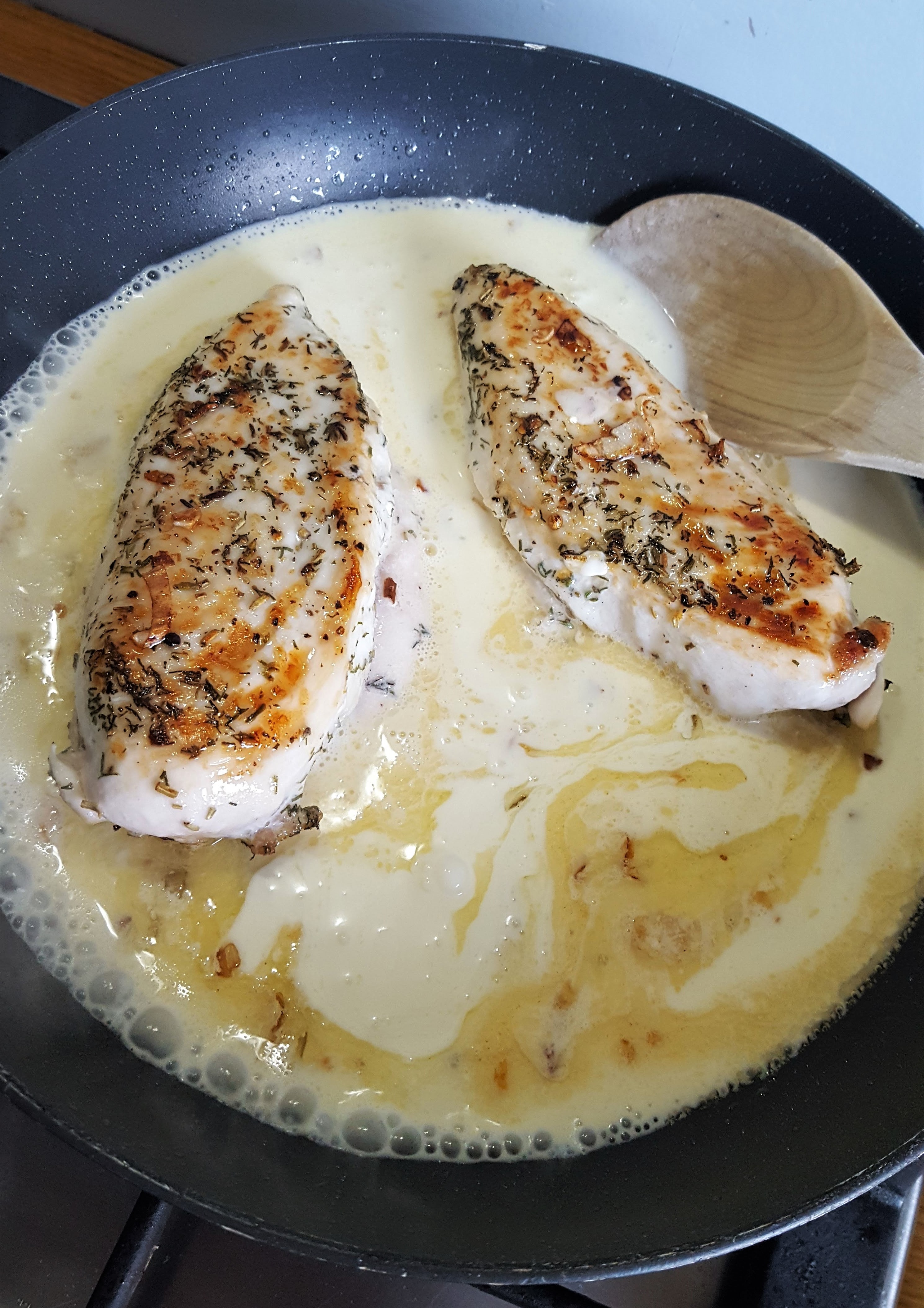 While the garlic and shallots are cooking, in a jug whisk the wine with the Dijon mustard. Once the shallots and garlic are sauteed (usually 2 minutes), turn the chicken smooth side back up and then add the wine and mustard mix to the pan and let bubble for a minute and then add in the cream. I find that the cream slightly curdles due to the acidity of the wine so I don’t pre-mix these before adding to the pan.