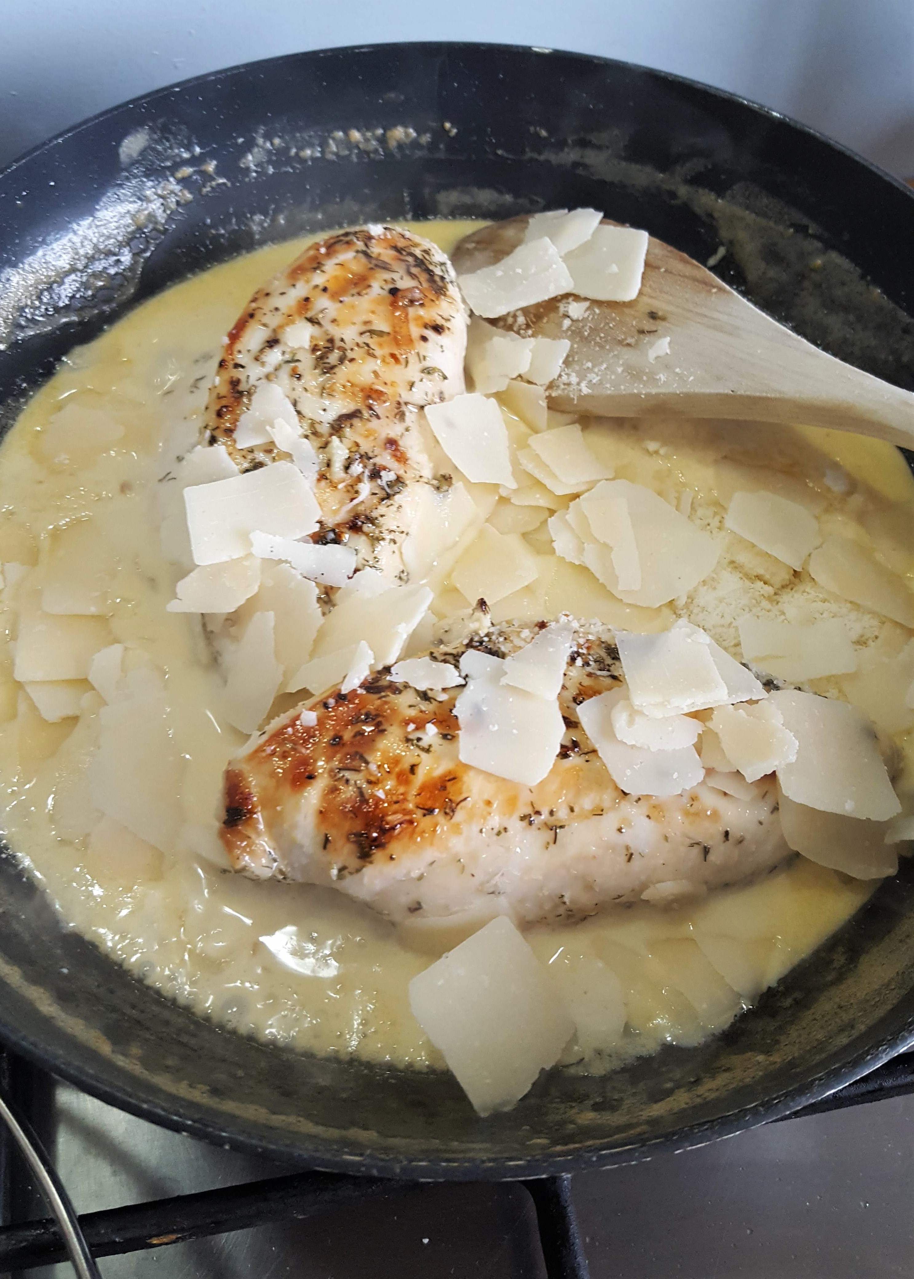 Cover the pan and let the chicken cook in the sauce for 15 to 20 minutes depending on the size of your fillets. Lift the lid and stir the sauce occasionally.