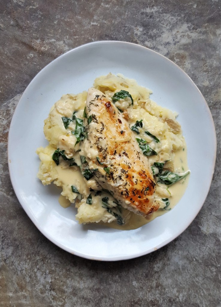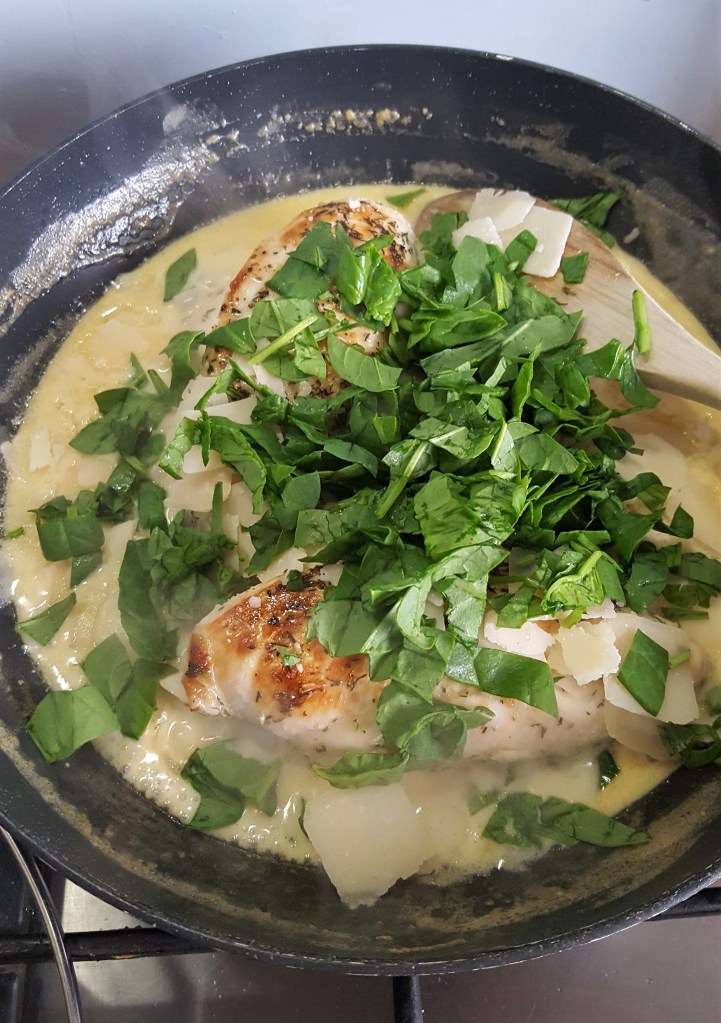 Turn off the heat and add in the Parmesan cheese and the chopped spinach and stir. No further cooking required, the heat from the pan will melt the cheese and wilt the spinach. Serve with potatoes, mash or pasta and enjoy.