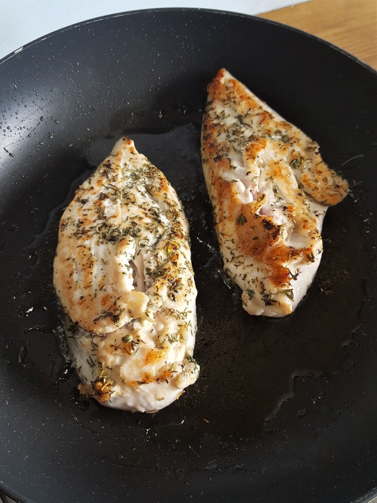 Place a skillet or frying pan over a medium heat. Add the 2 tbsp of sunflower oil to heat. I use sunflower oil here as it has a higher threshold for heat and the herbs on the chicken won’t burn.