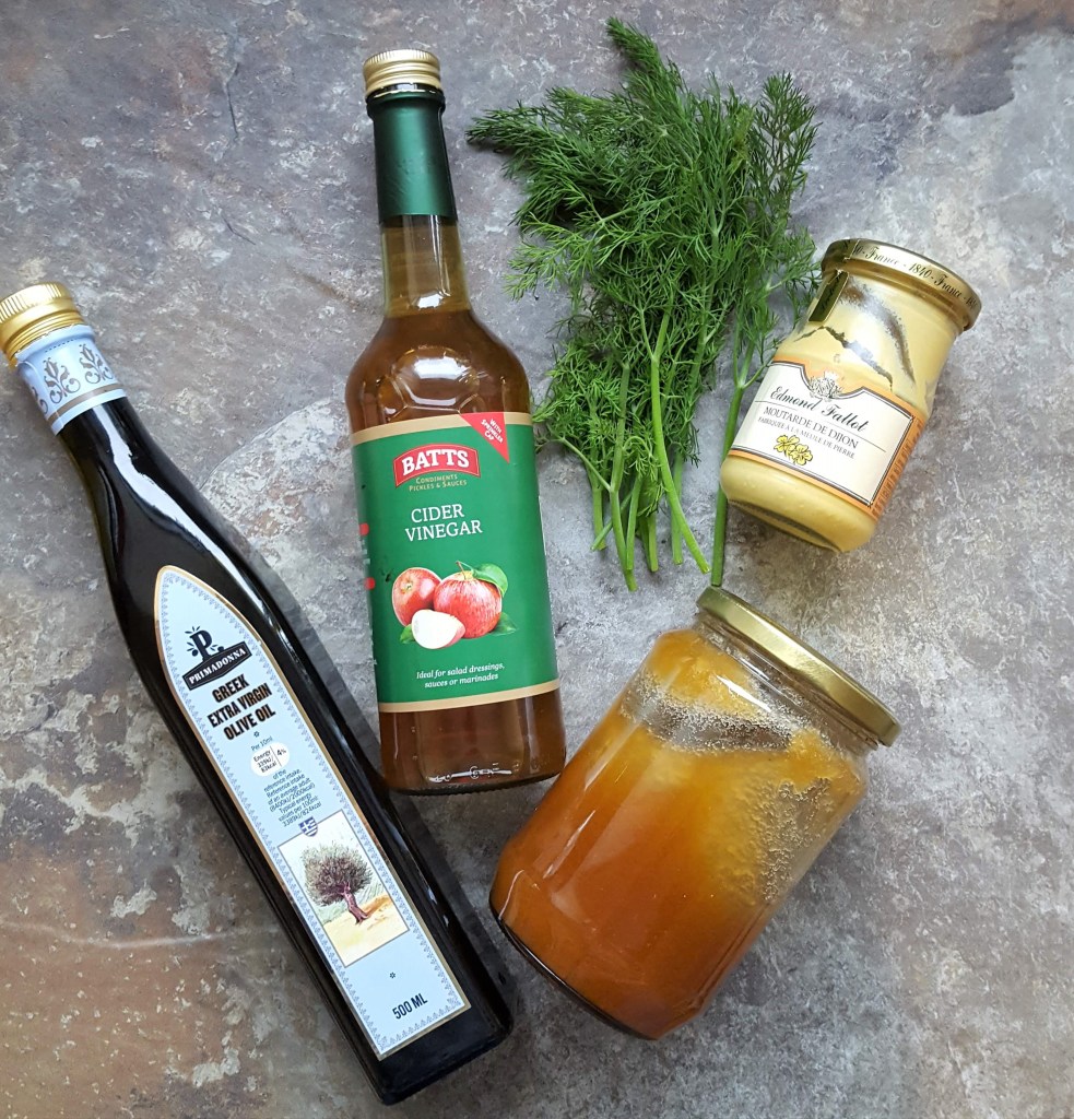 To the honey, add 2 tbsp of the Dijon and the cider vinegar and whisk together. Depending on your love of mustard, start with 2 tbsp and you can add the extra tablespoon if you like it hotter.