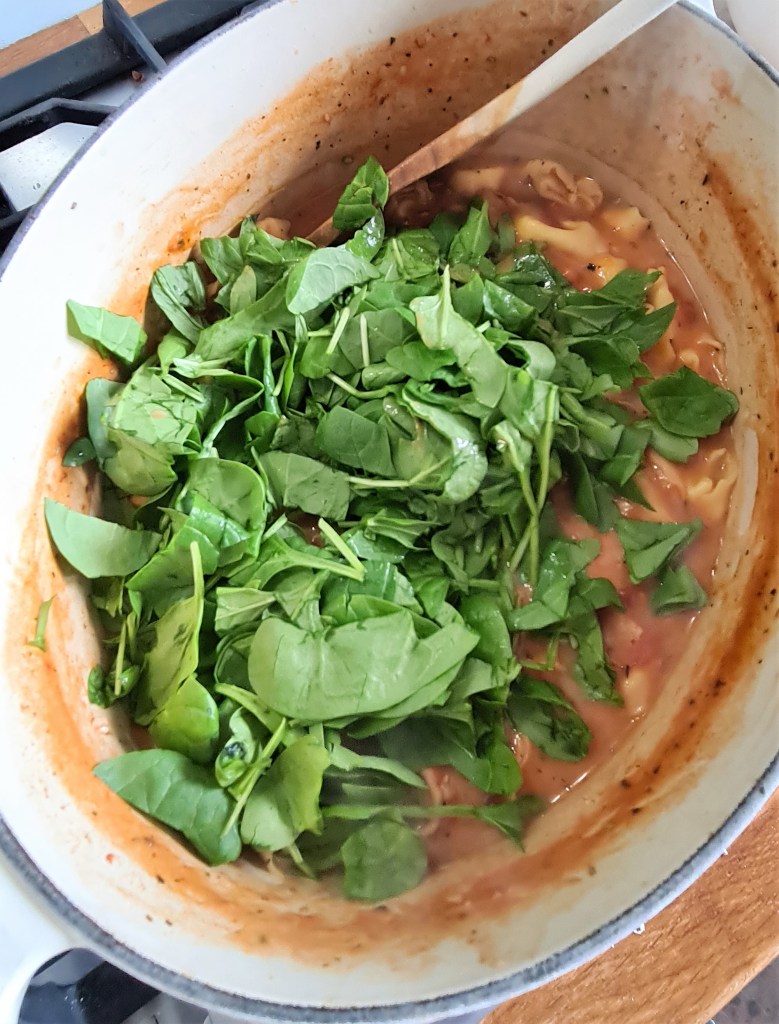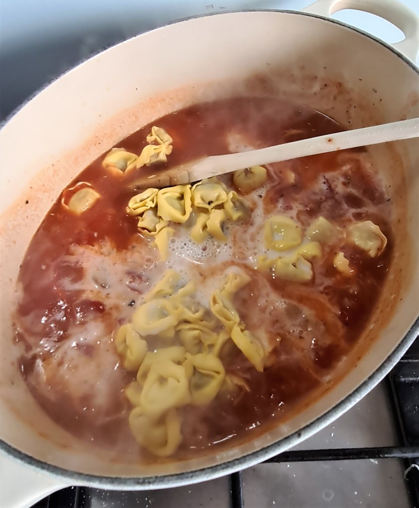 Add in the cappelletti. Bring to the boil and then cook on a simmer for about 10 minutes until the pasta is tender.
