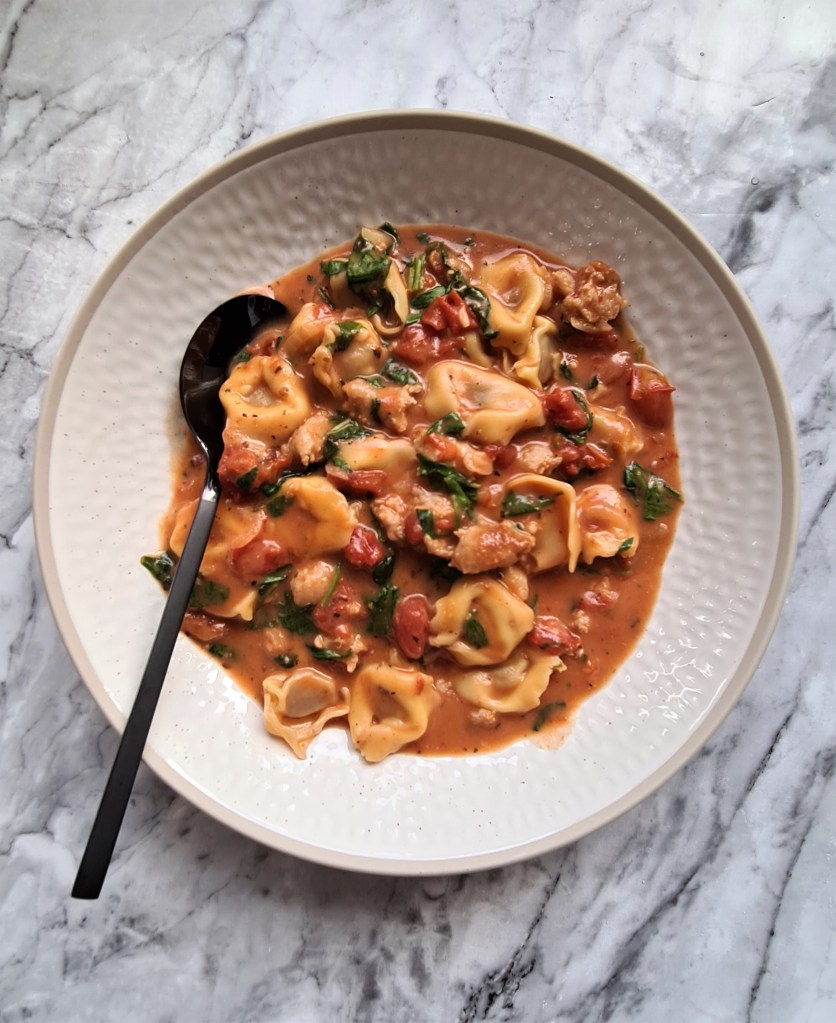 My favourite cosy mid week meal to throw together with little effort, filled with tasty bites of sausage, tender cappelletti (smaller bite sized filled pasta) and wilted spinach in an Italian style soup.
