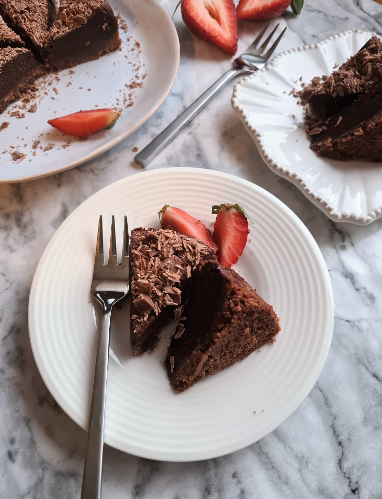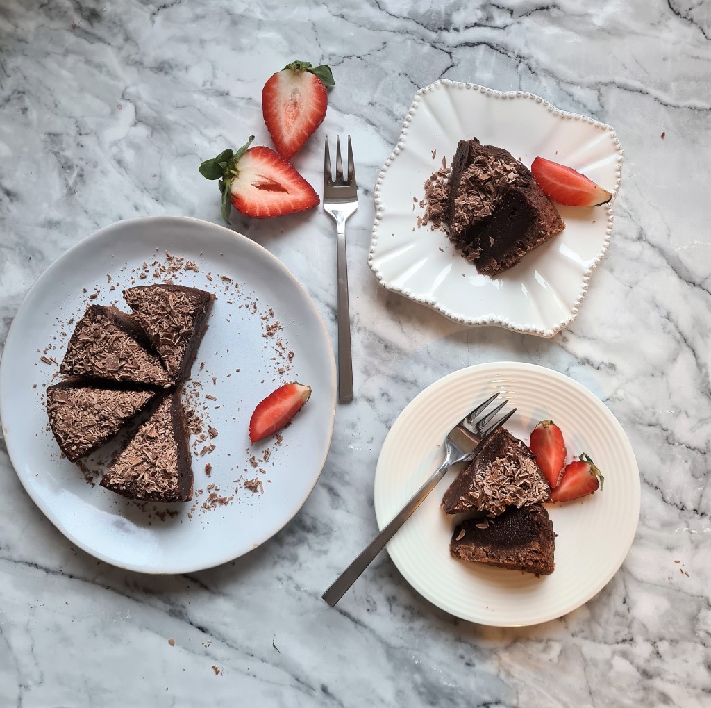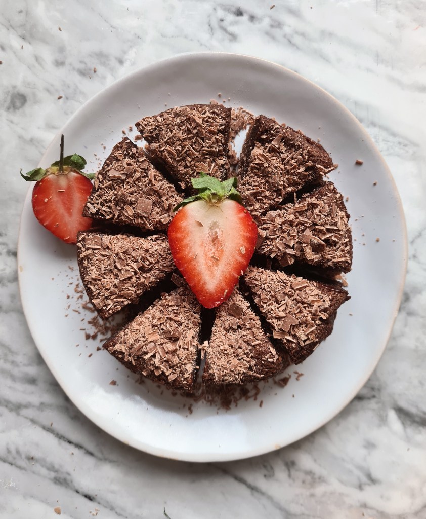This brownie cake is perfect for a little sneaky treat or dessert that doesn’t have you eating it for a week. It is designed for two people. I like to cut it into eight small pieces (about 4 bites per piece) and have it over two days, or in my case when my son goes to bed, I run a bath, pour a glass of wine and while the water flows, I go down to the kitchen and sneak one piece of this cake and eat it while the bath fills. It is the little simple moments to myself that keep me going these days.