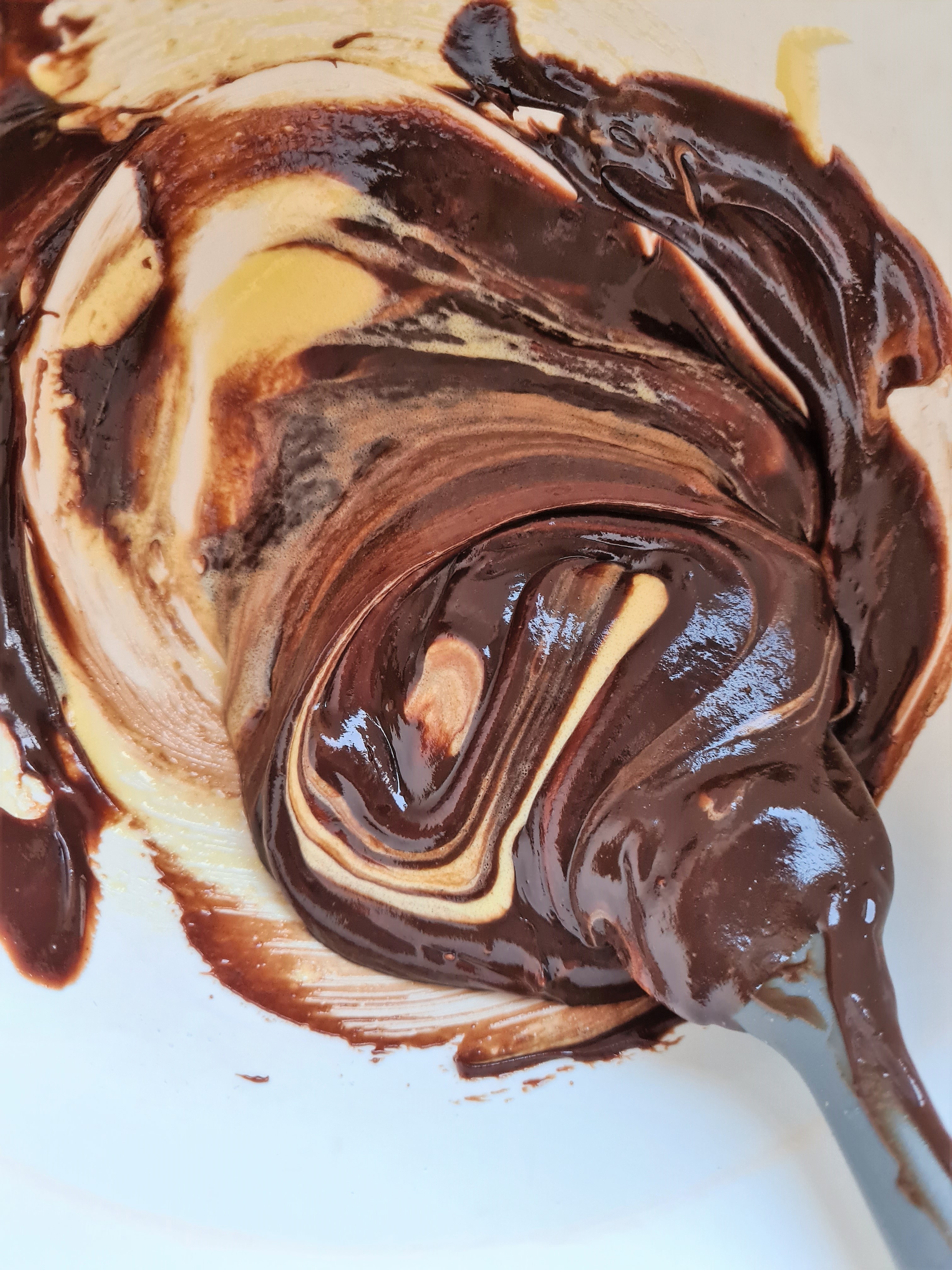 Make the filling now: Melt the butter and chocolate together. I use a Pyrex bowl and the microwave as it is such a small amount we are making. About 30 seconds, then stir, then another 20 seconds. Stir really well when you take it out of the microwave. There will still be chunks of chocolate but this will melt with the residual heat.