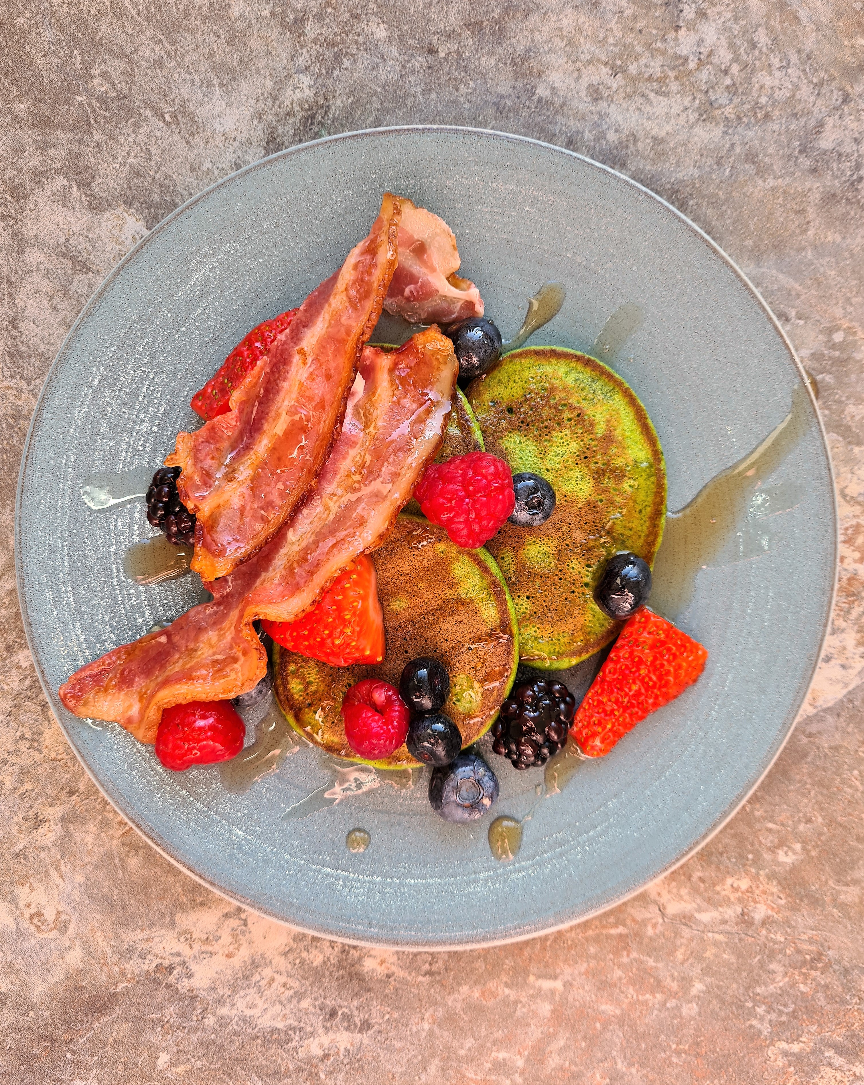 The trick here is to cook on a low heat so they don’t burn before the little bubbles form on the top of the uncooked side, about 1 minute on a low flame and then once the bubbles form and the edges aren’t runny, flip them over and cook for another 30 seconds to 1 minute until they have fluffed up and turned golden brown. Repeat until the batter is all used up and then serve with crispy bacon and mixed berries and of course lashings of maple syrup.