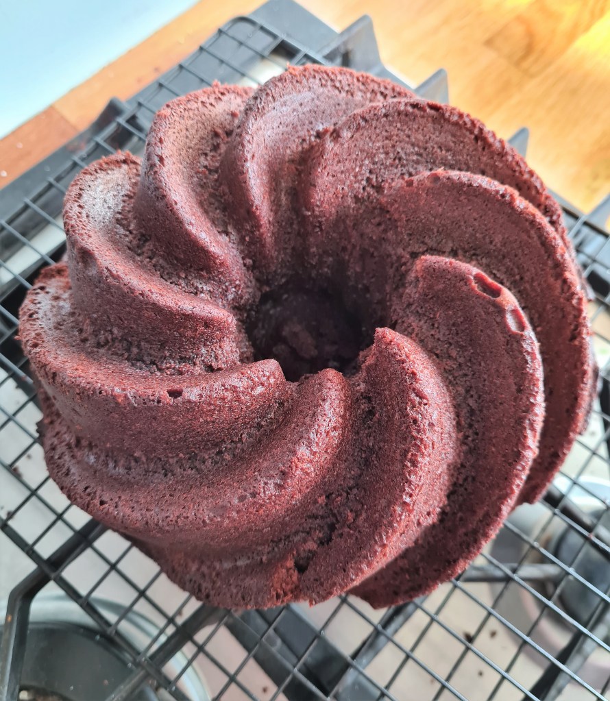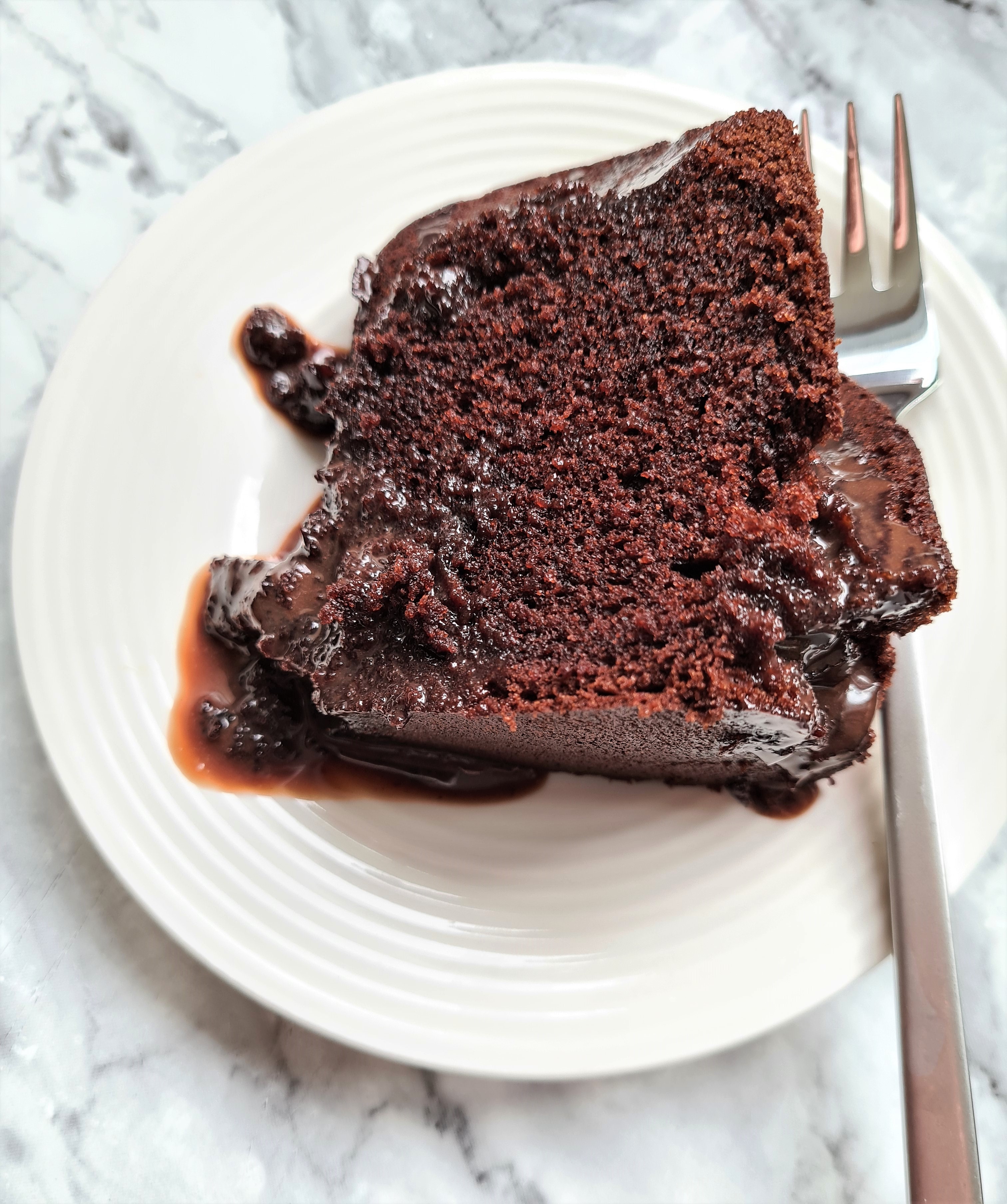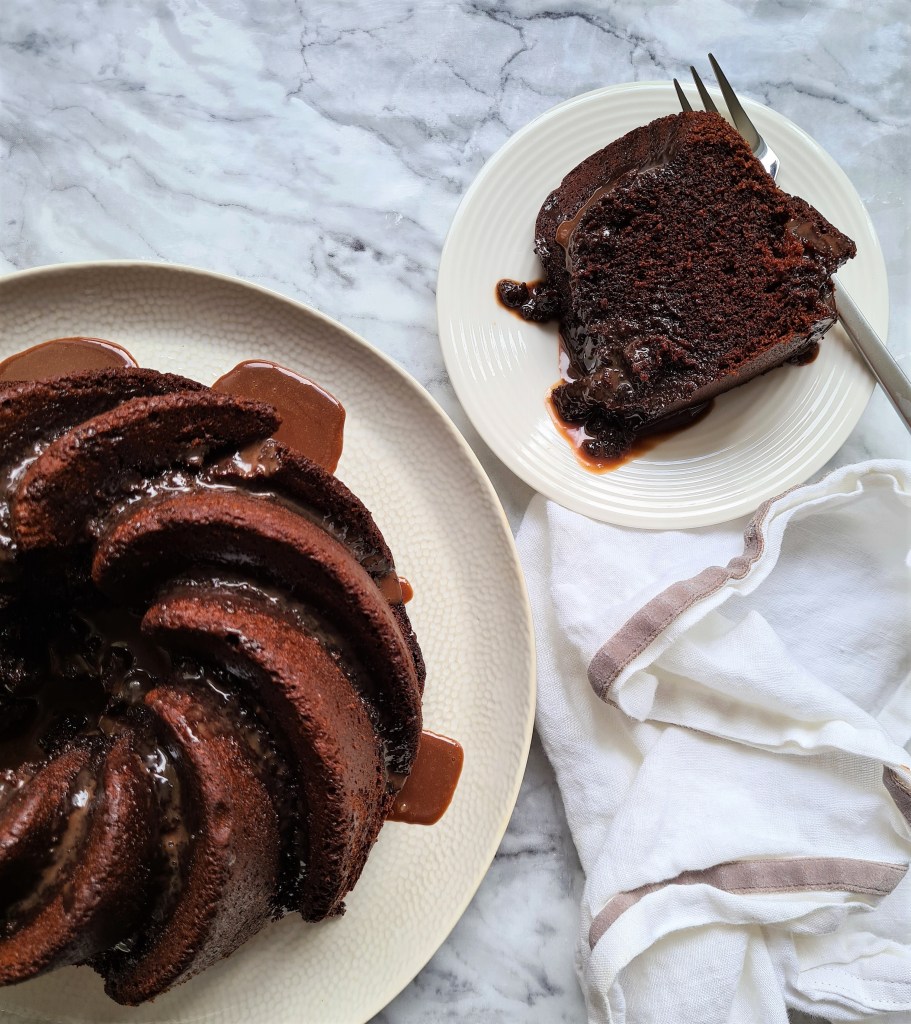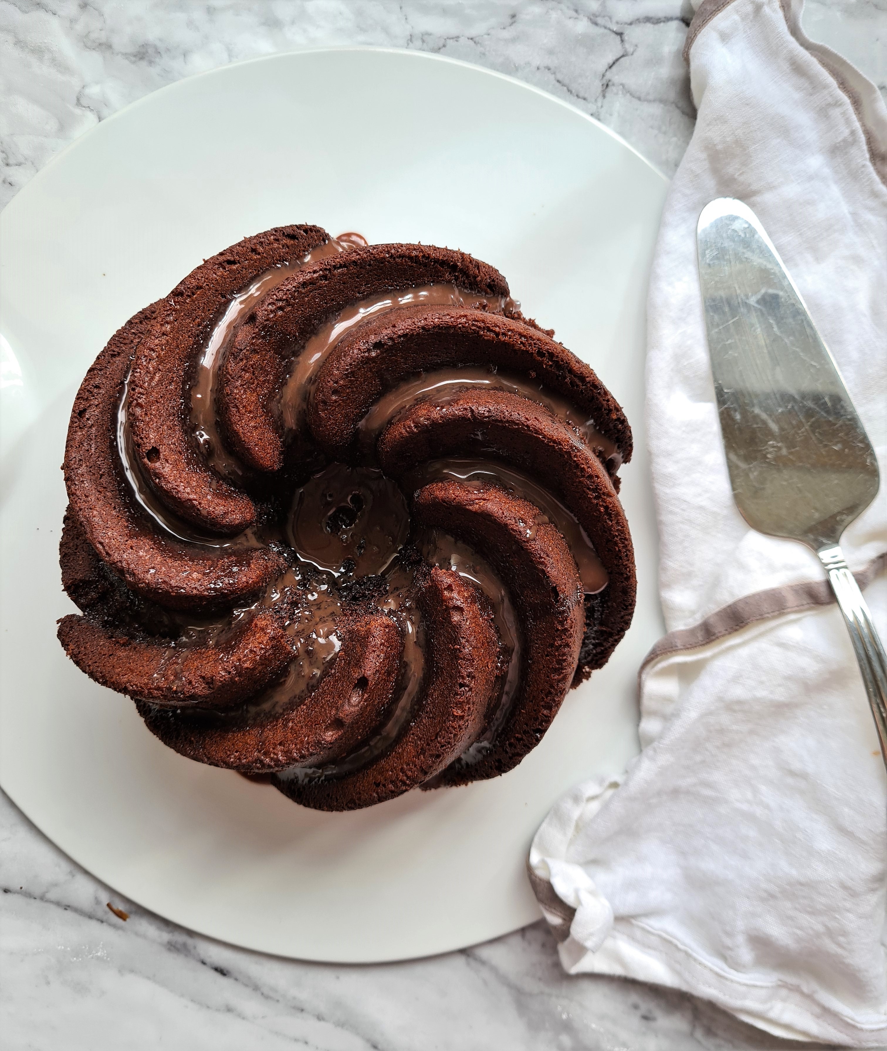 I love how a Bundt tin makes a cake look so much prettier and presentable without having to slather it in icing and decorations. The cake can speak for itself. The drizzle I use on this, isn’t thick, it just adds a little bit of gloss to the ridges of the bundt and seeps into the cake rather than just sitting on top of the sponge. This makes it extra moist and just so yummy!