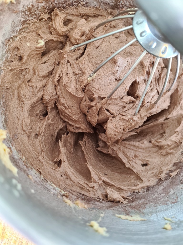 Add the second third of the flour/cocoa mix to the bowl and mix gently again.